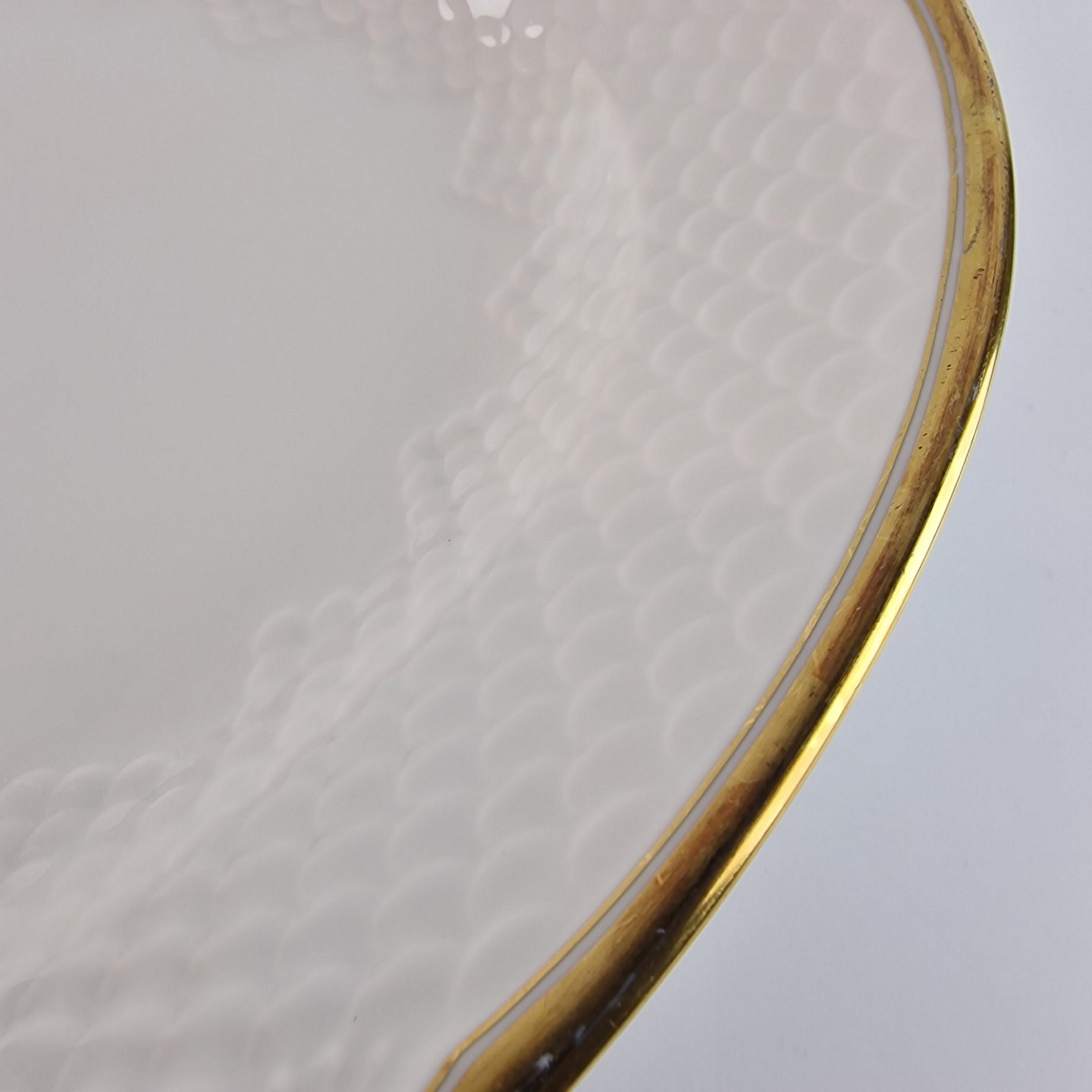 Åkjær er cremefarvet porcelæn med guldkant og mønster som skæl
