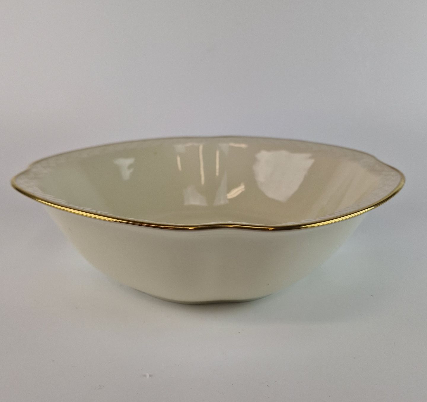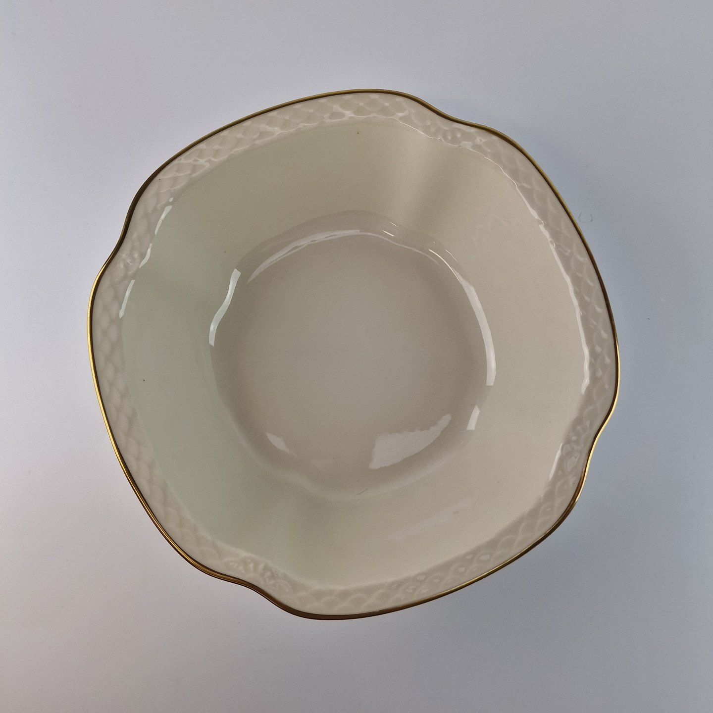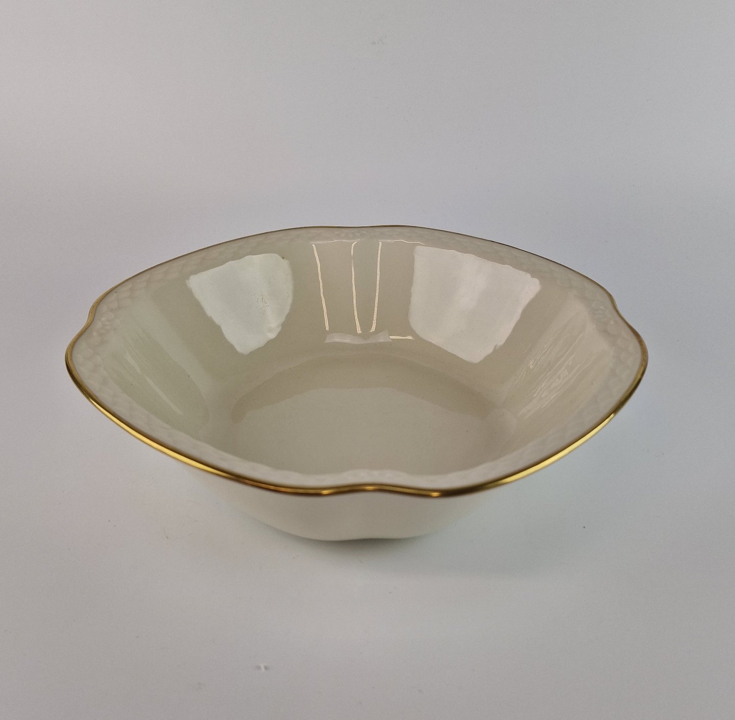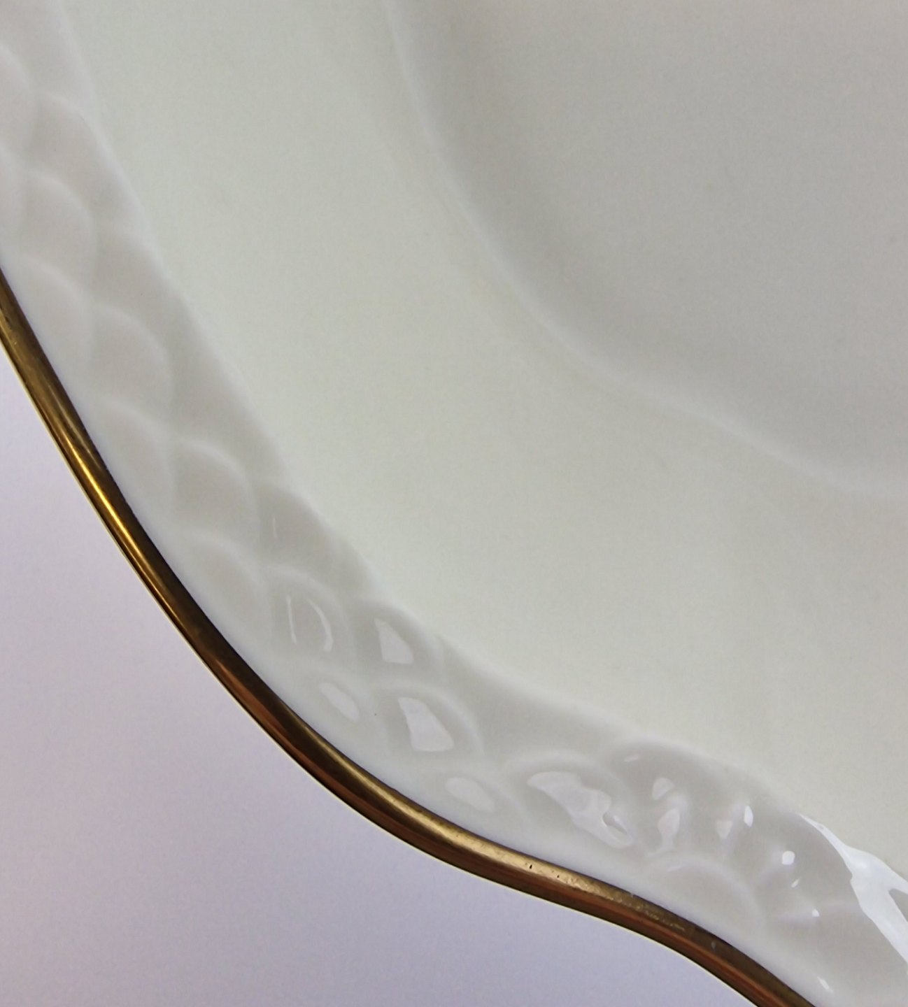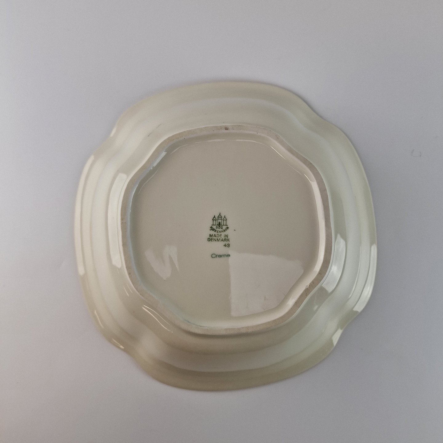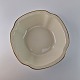 Åkjær er cremefarvet porcelæn med guldkant og mønster som ligner skæl