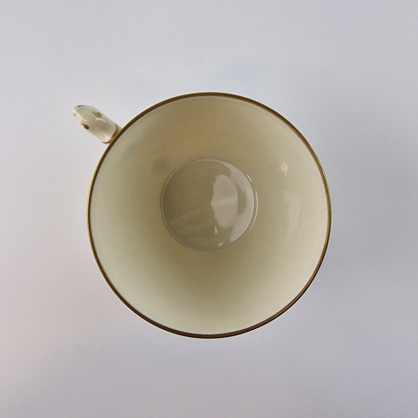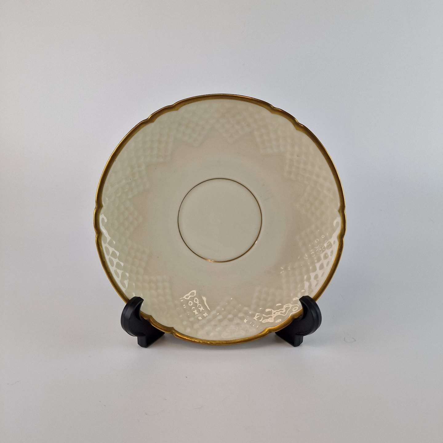 Åkjær er cremefarvet porcelæn med guldkant og mønster som ligner skæl