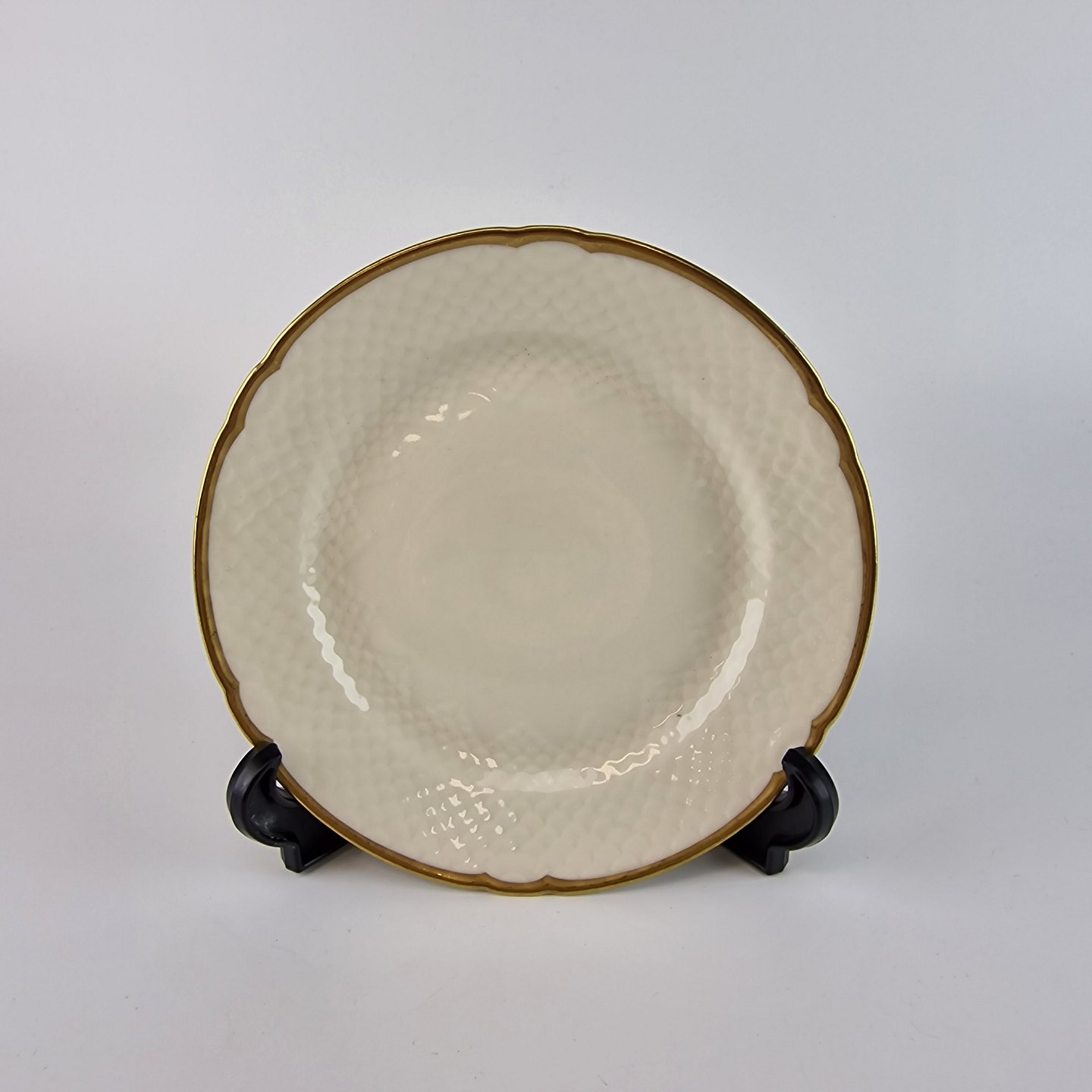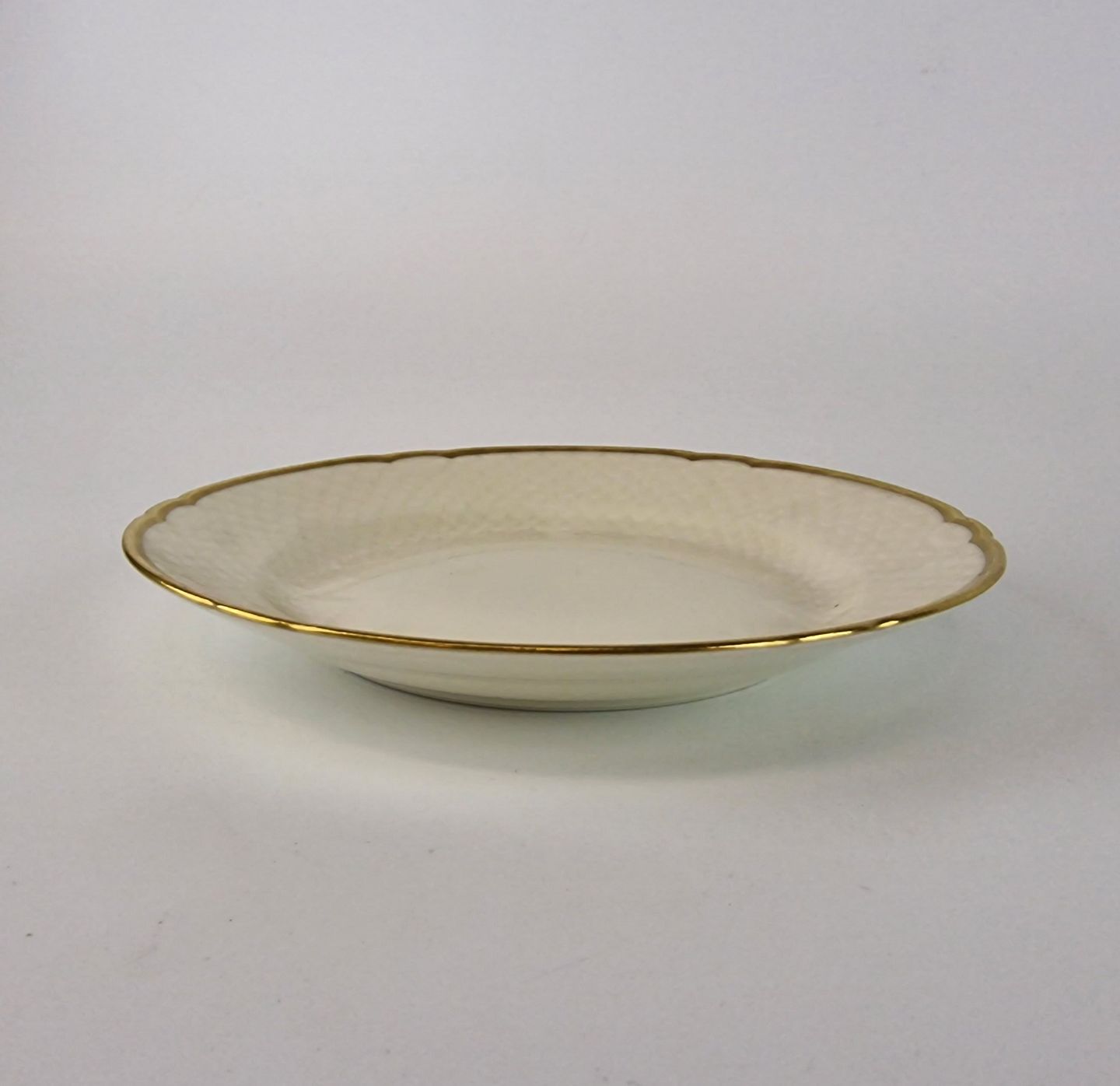 Åkjær er cremefarvet porcelæn med guldkant og mønster som ligner skæl