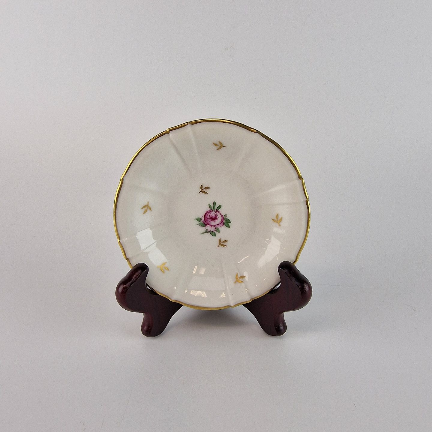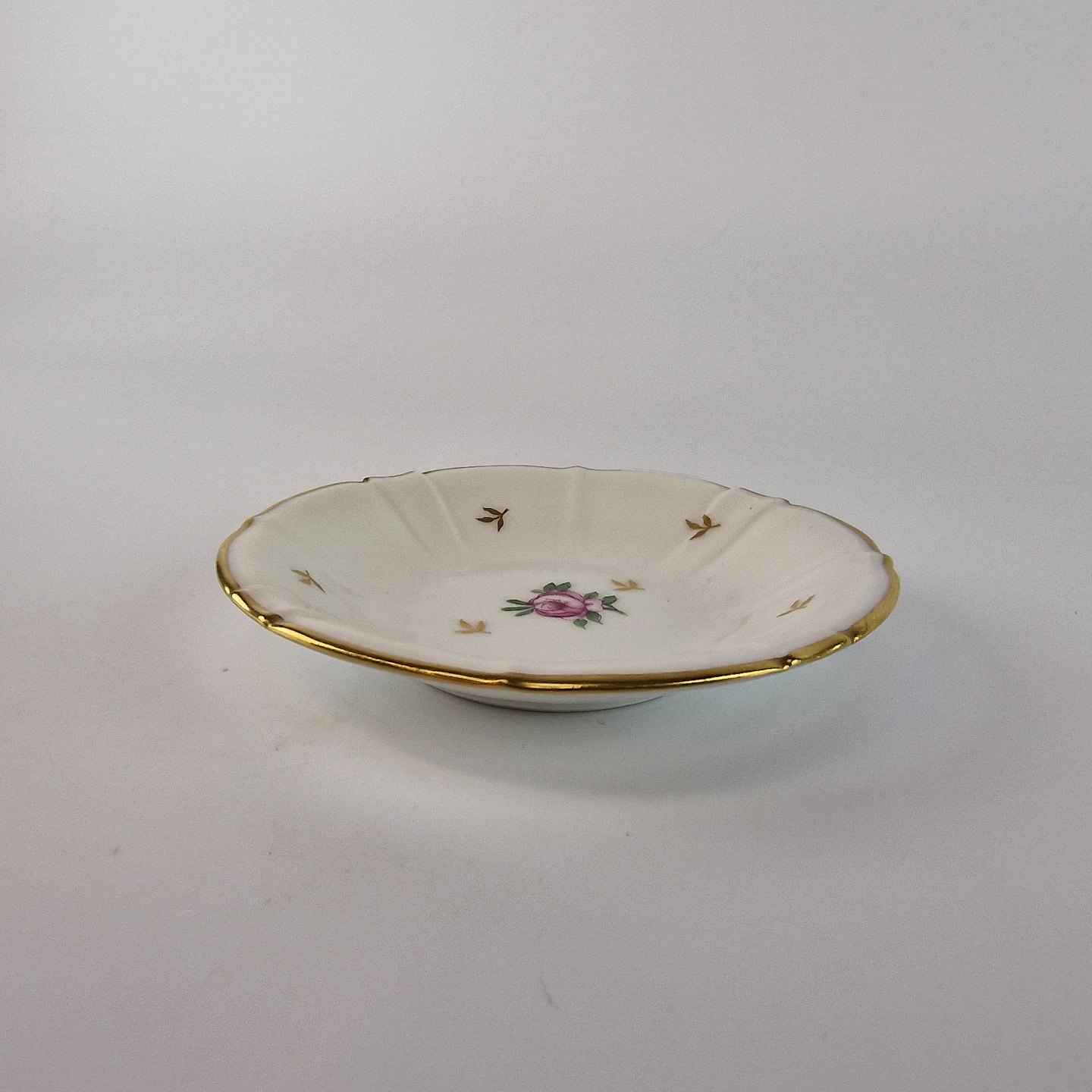 Roselil er kantet hvidt porcelæn med bred guldkant og er dekoreret med roser og blade