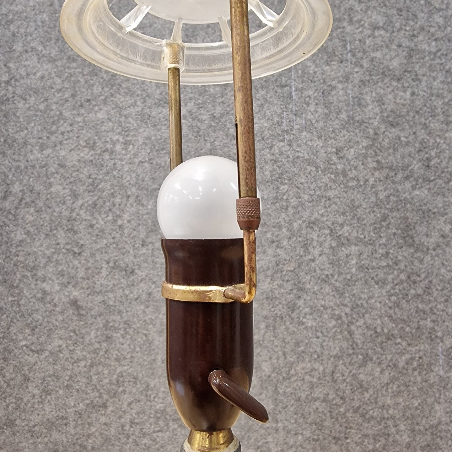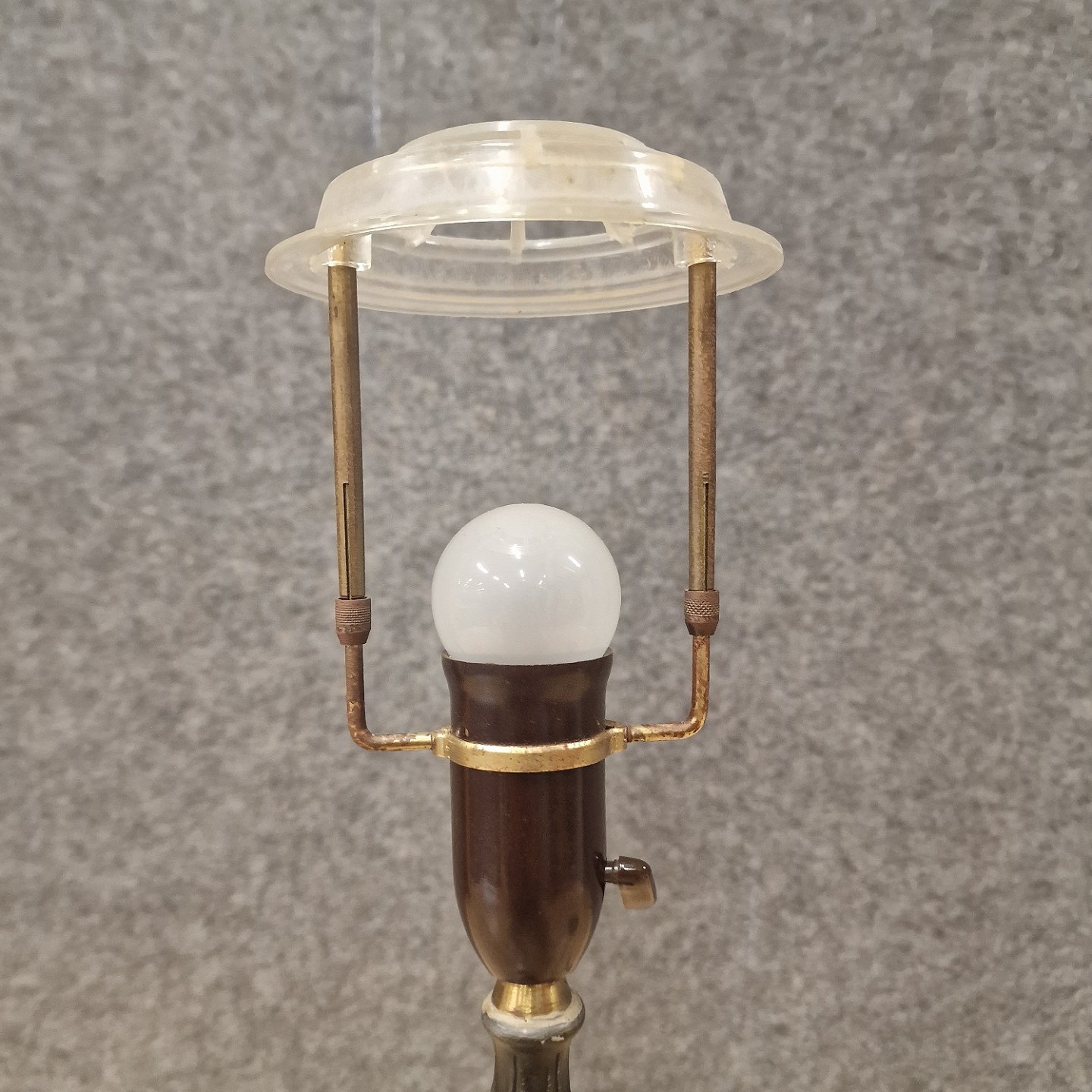 Bordlampe af sort metal. Foden er dekoneret med svaner