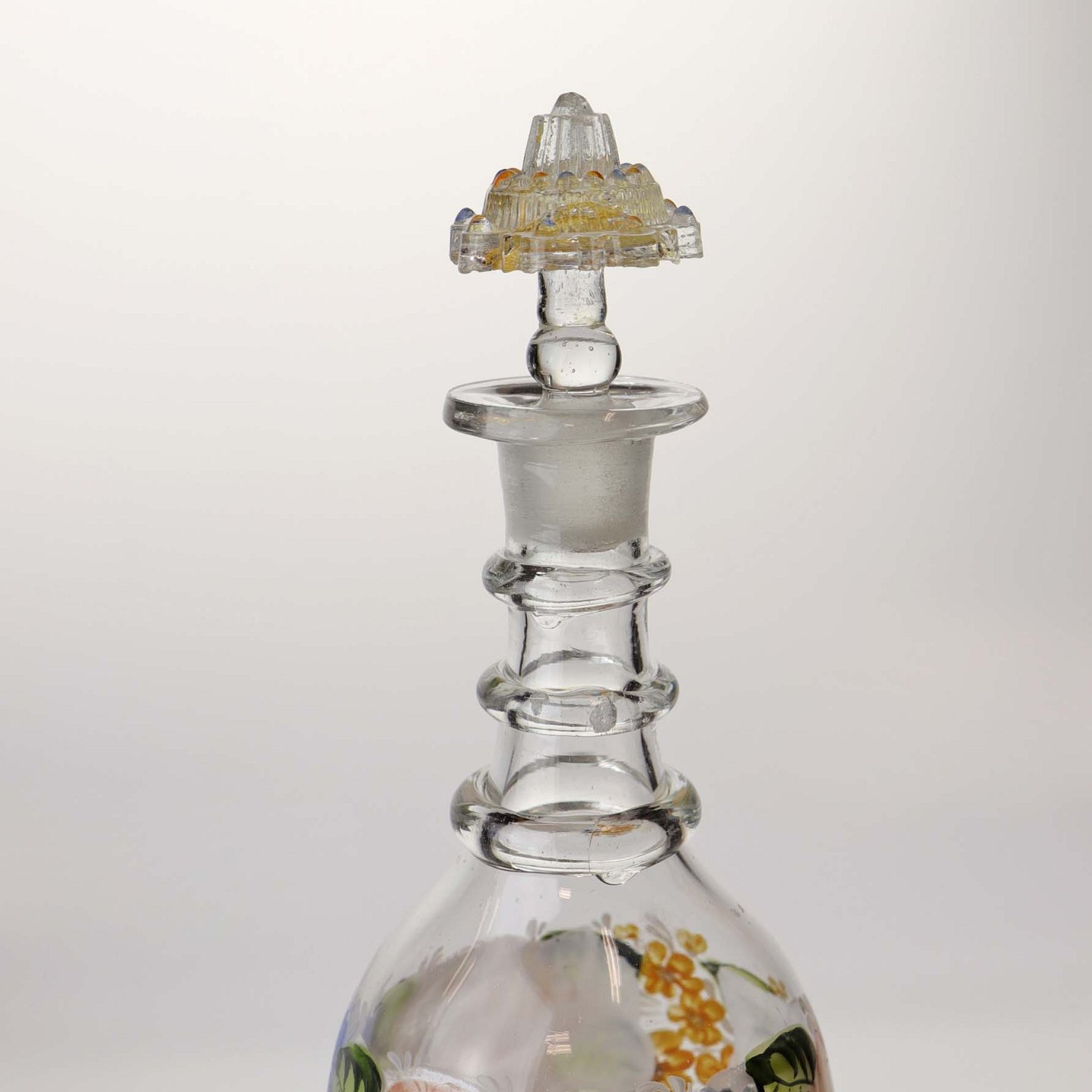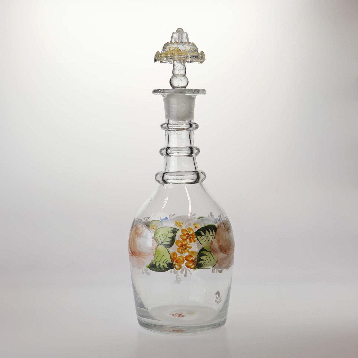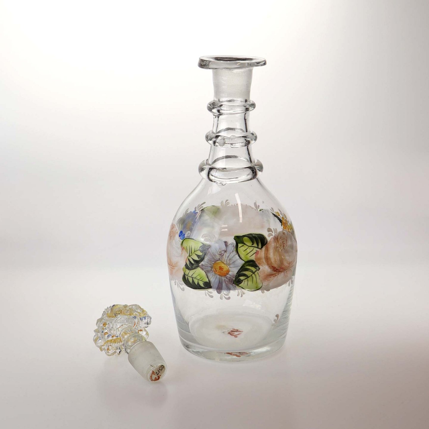 Karaffel dekoreret med blomster og blade af emalje maling.