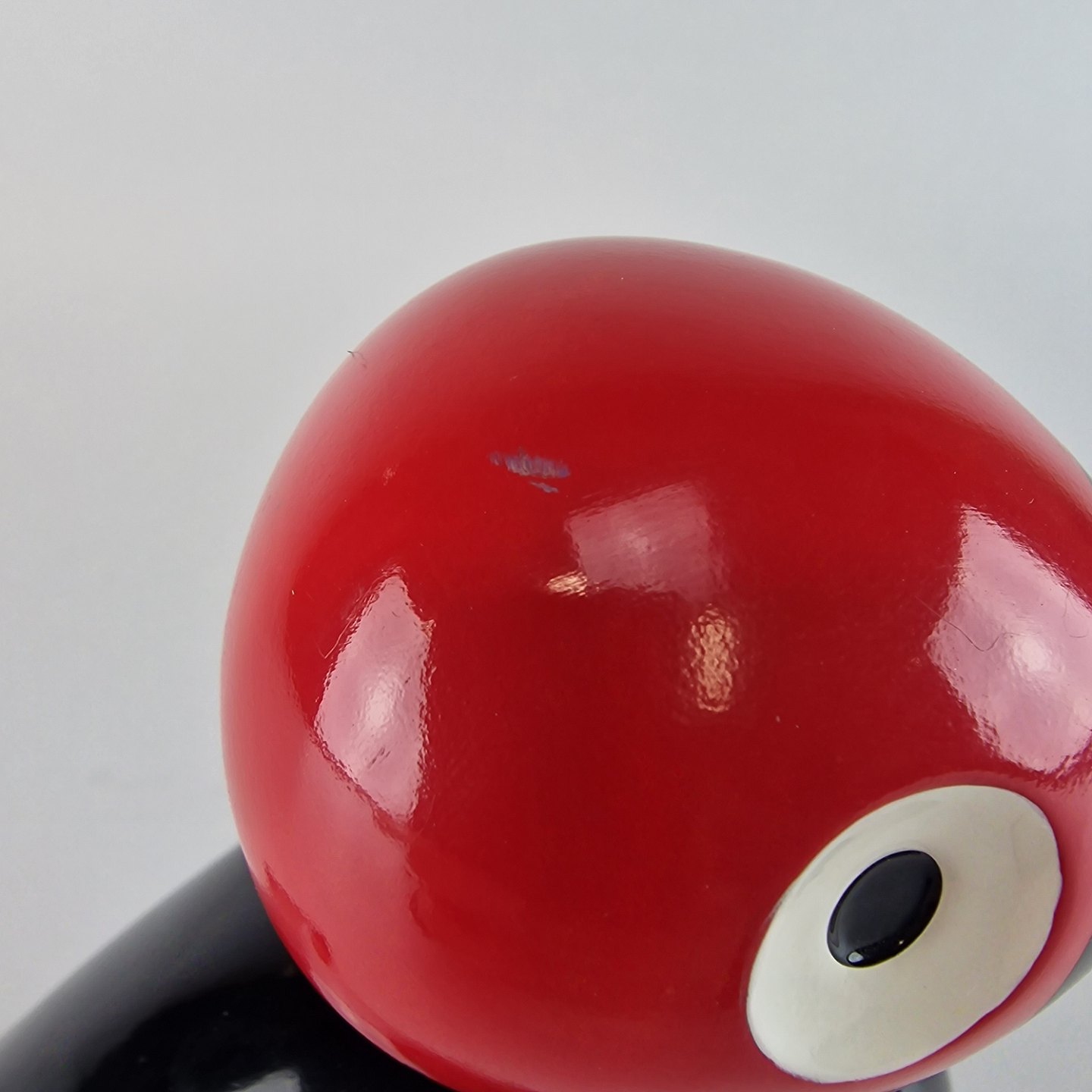 Figur af malet bøgetræ fra serien Sangfugl. Peter har sort krop, rødt hoved, sort næb og gule ben.