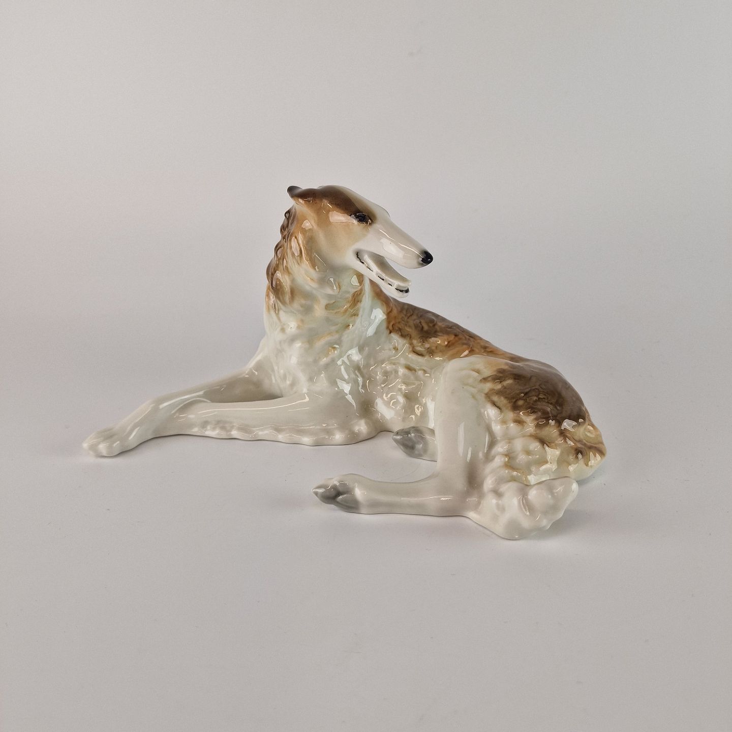 Figur af porcelæn, formet som en Borzoi (russisk mynde) i hvide, brune og gyldne farver.