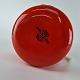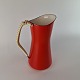 Orangerød kande af emalje. Hanken er beklædt med flettet plast
