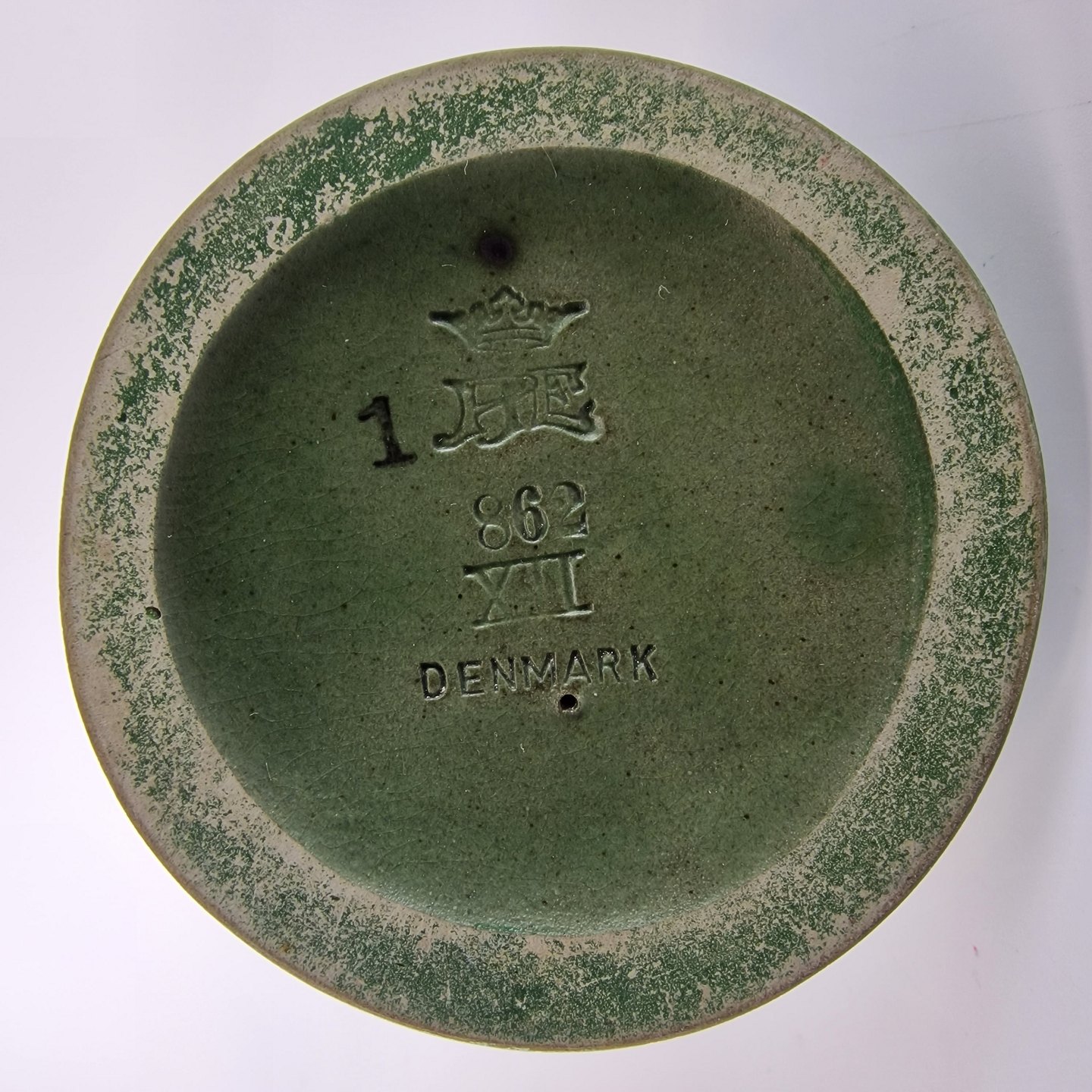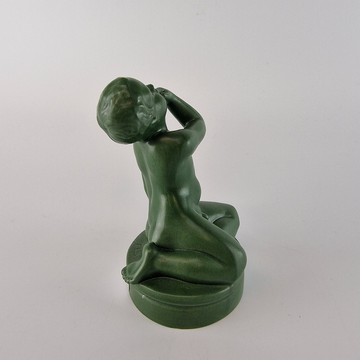 Grøn keramik figur af en dreng som sidder med finger i mund