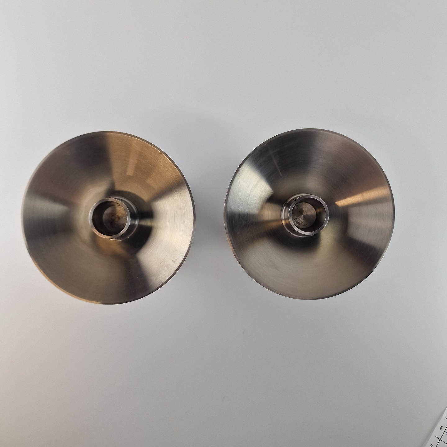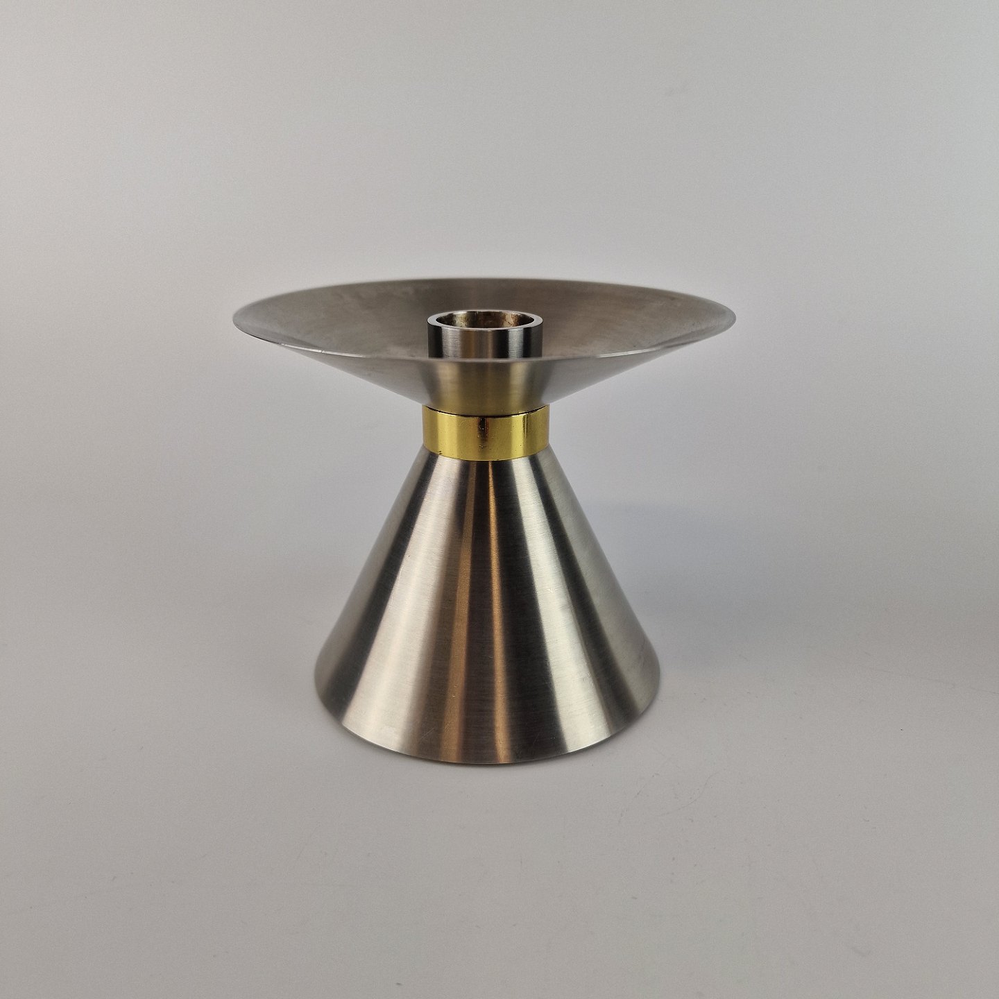 To lysestager af blankpoleret stål og ring af messing. No 0226 og 0288