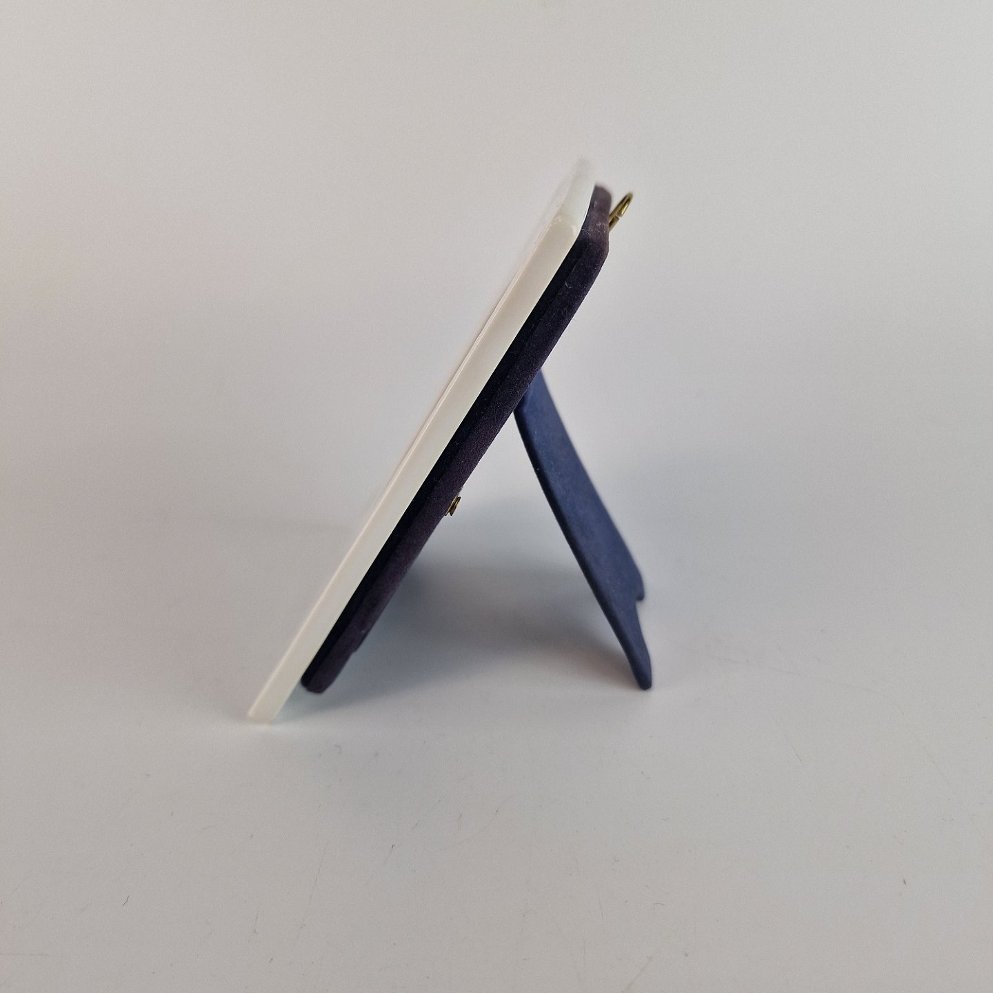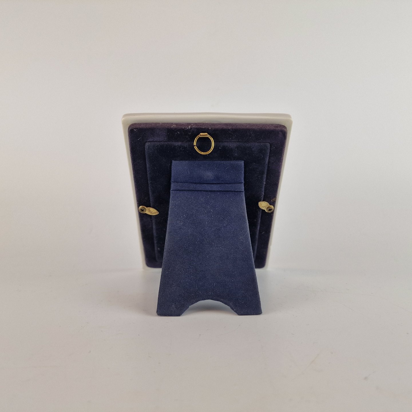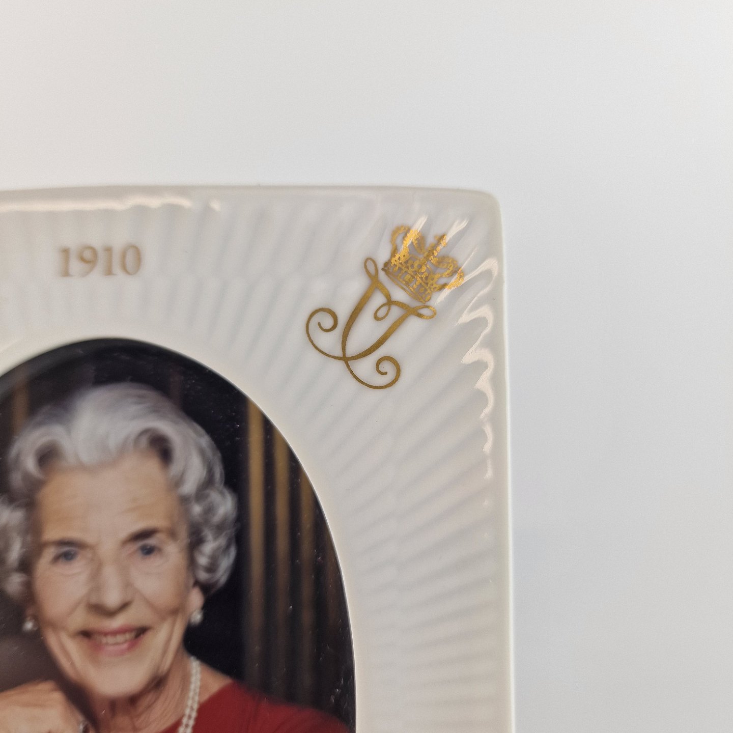 Porcelænsramme givet til medarbejdere i anledning af Dronning Ingrids 90 år fødselsdag. Kgl. Hoffotograf Rigmor Mydtskov har taget billedet som fulgte med rammen