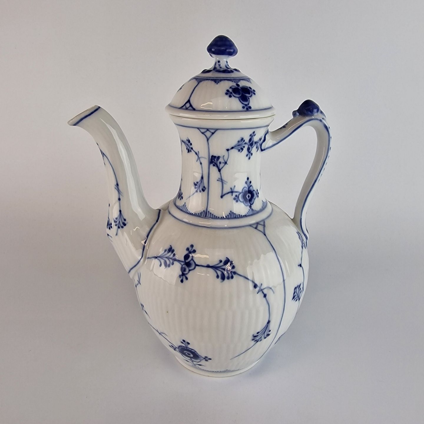Riflet hvidt porcelæn med dekoration af blå ranker og blomster