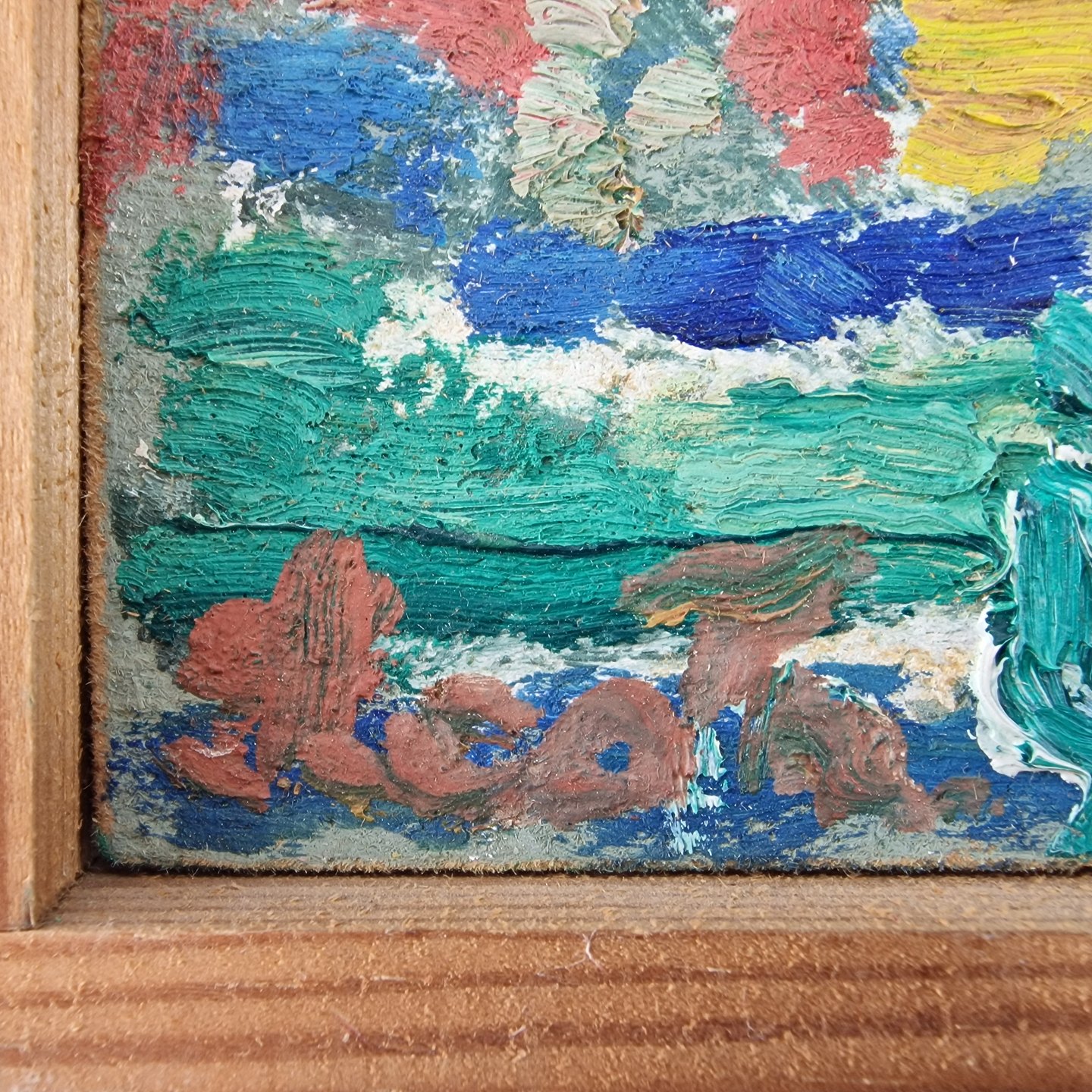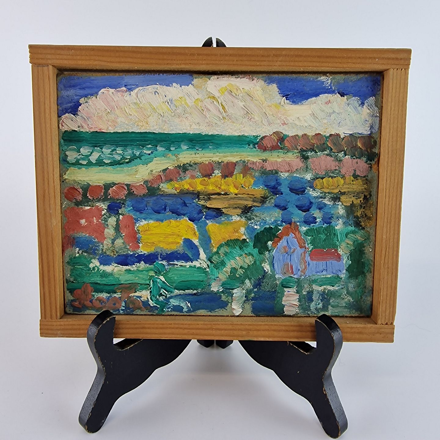 Oliemaleri på plade med abstrakt landskabsmaleri med motiv af kirke blandt marker og enge under titlen Sensommeren fra år 1980