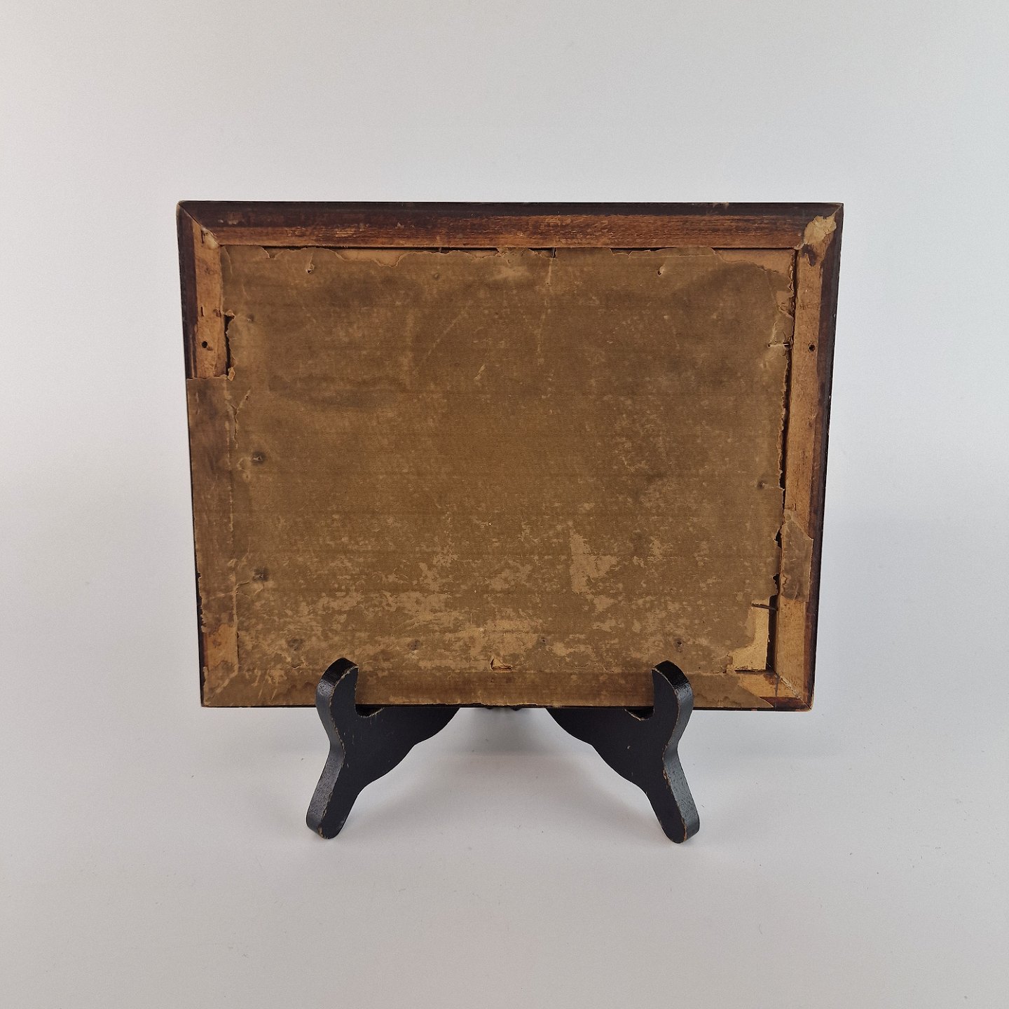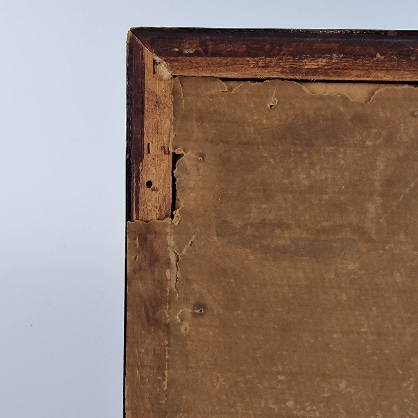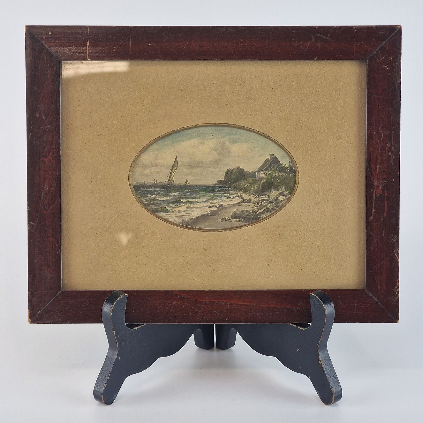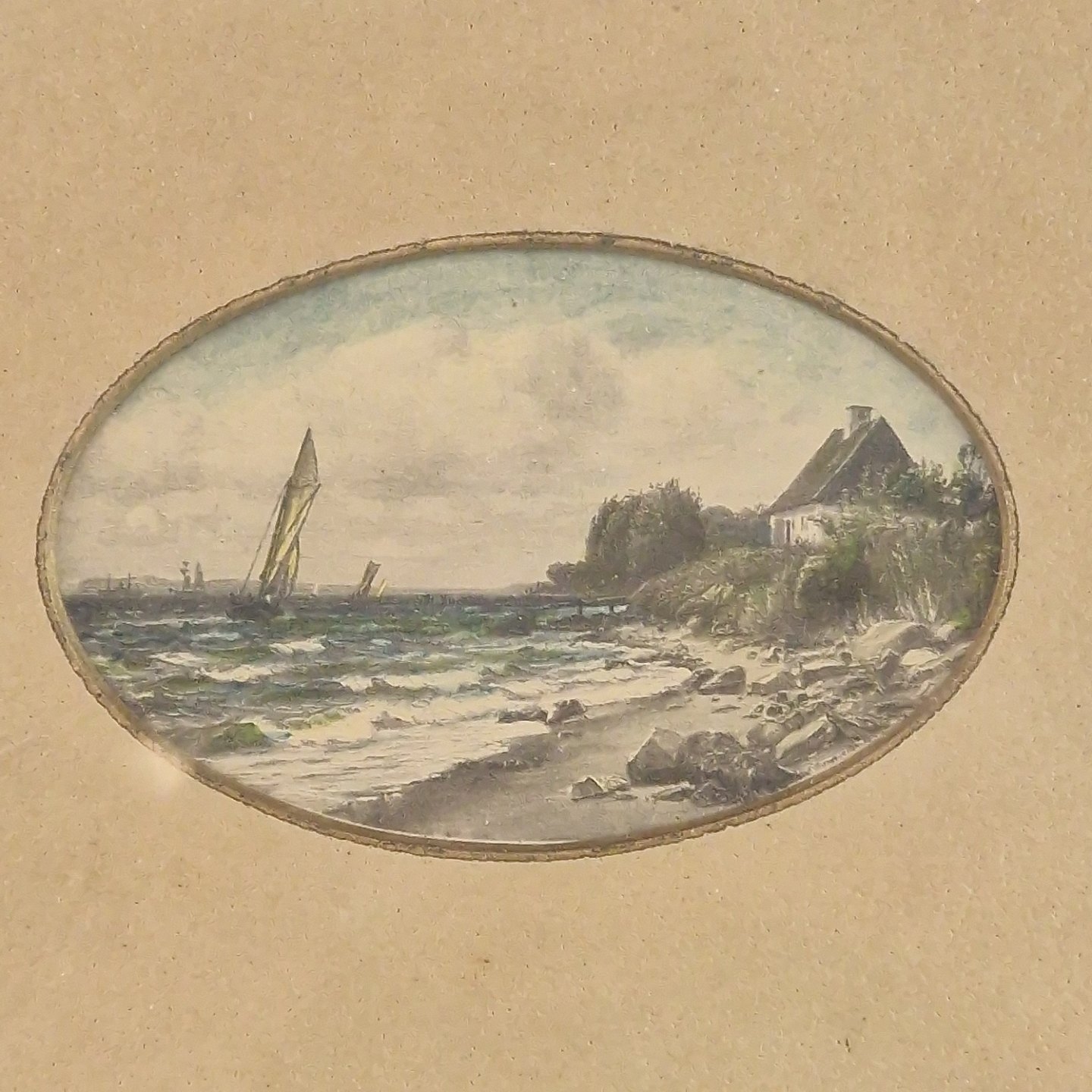 Indrammet ovalt landskabsmaleri i passepartout med motiv af kyststrækning. Et hus beliggende tæt på stranden og seljbåde i havet