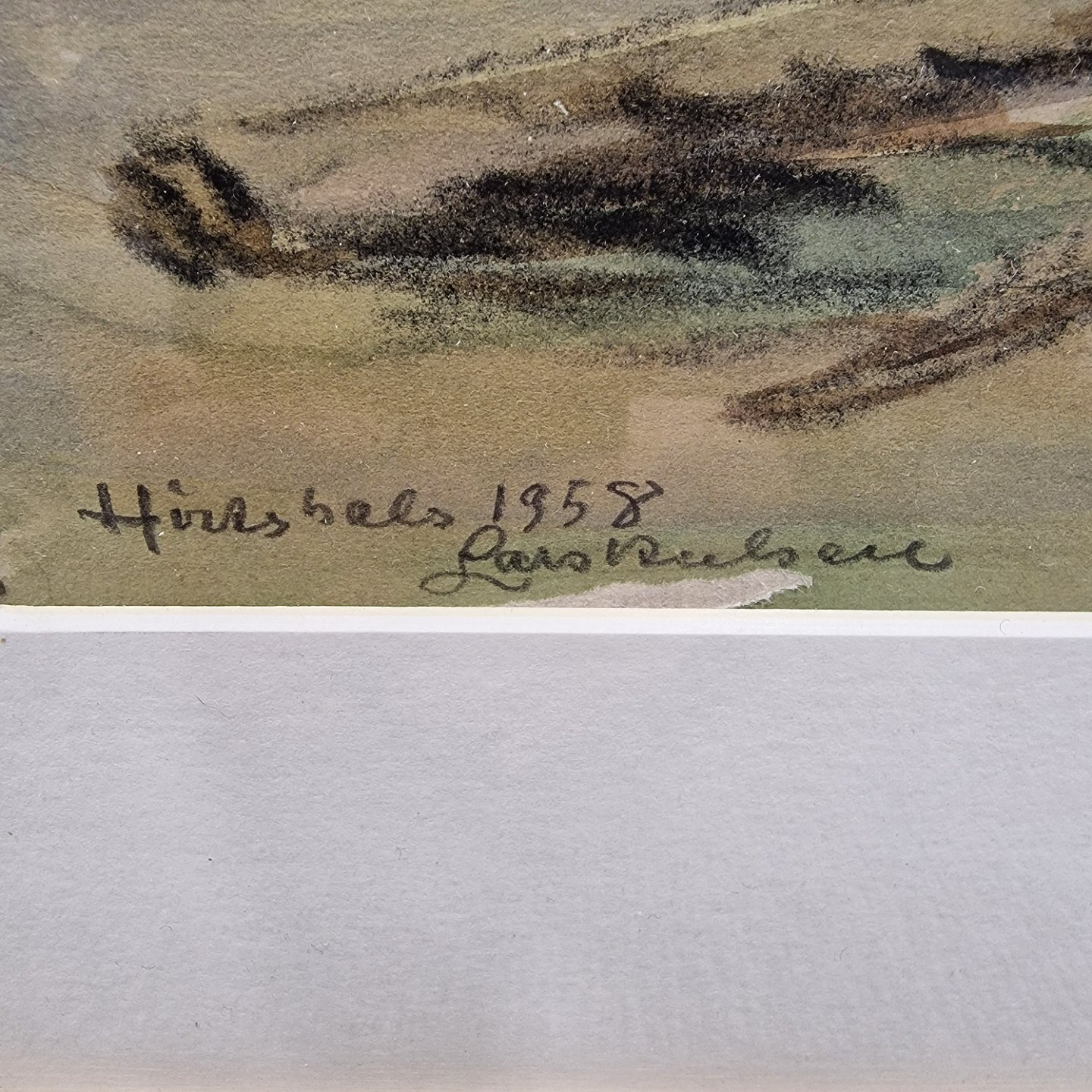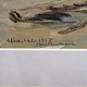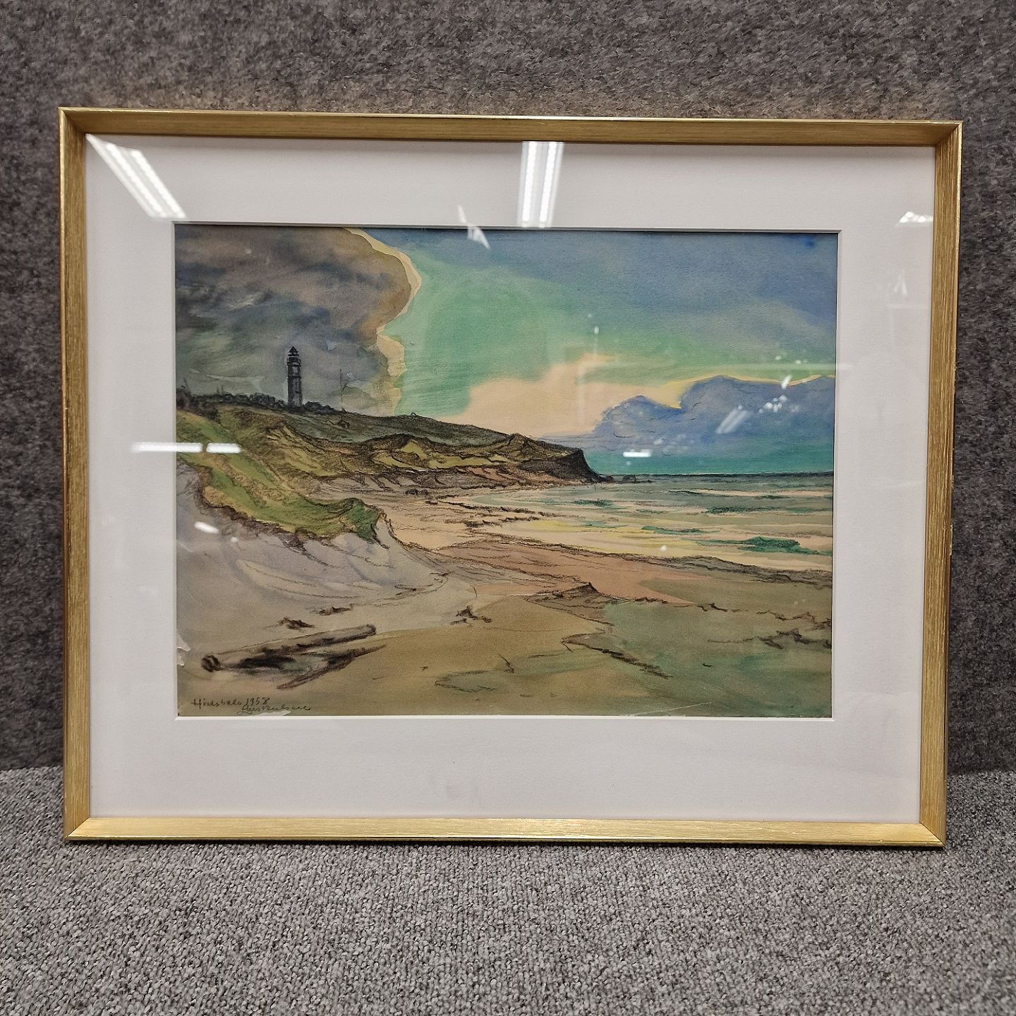 Indrammet akvarelmaleri i passepartout i gylden træramme. Landskabsmaleri i akvarelmaling med motiv af Hirtshals strand og fyrtårn fra 1958