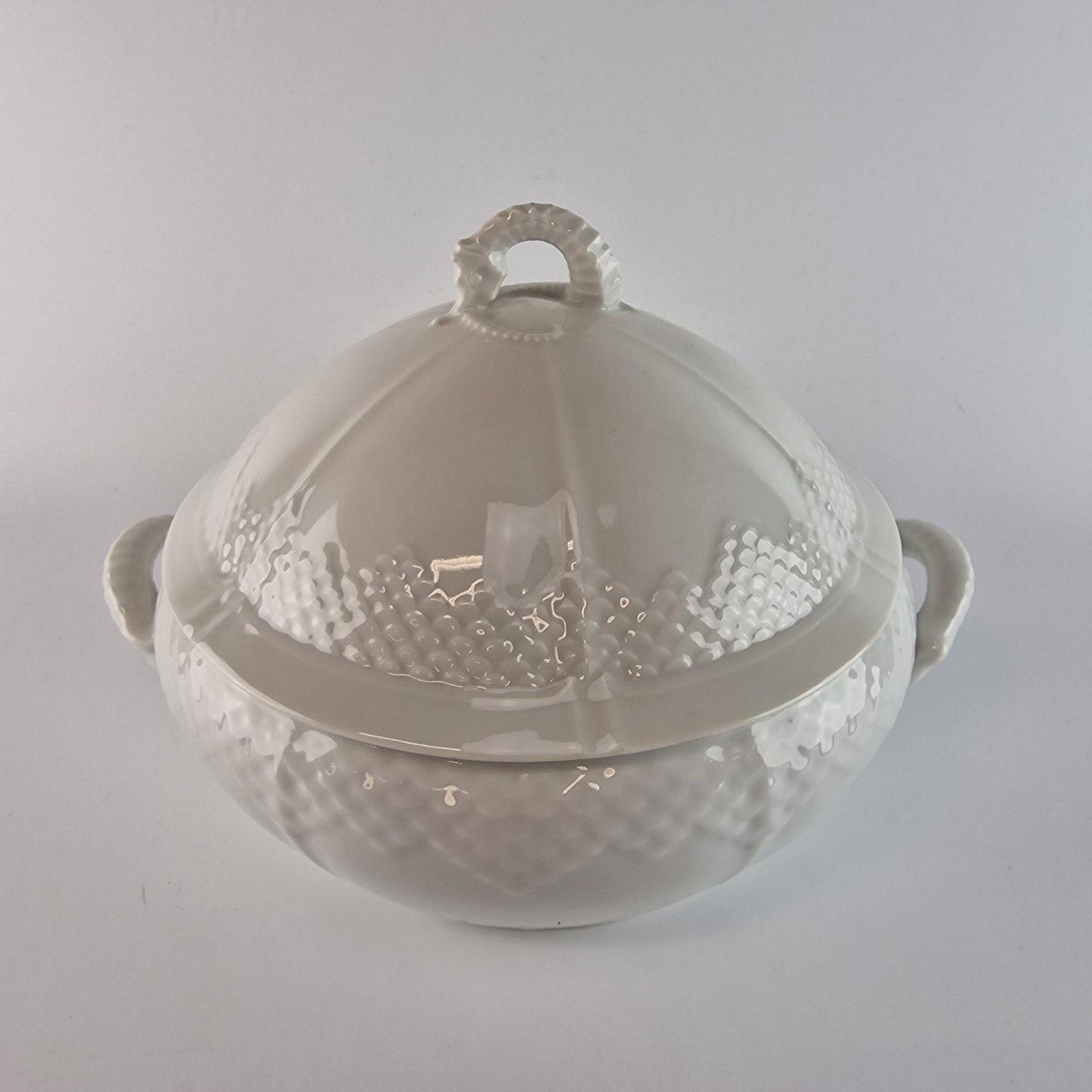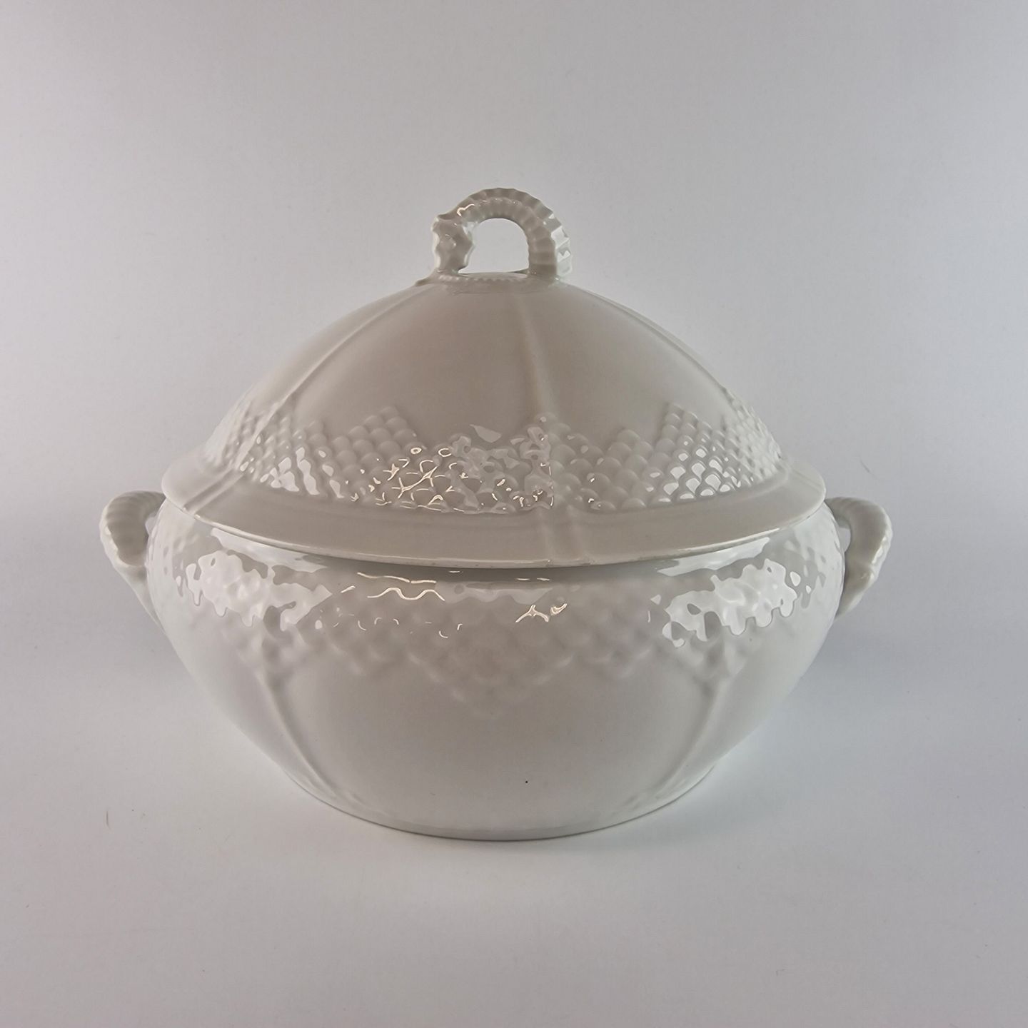 Elegance er hvidt glaseret porcelæn med et skæl lignende mønster
