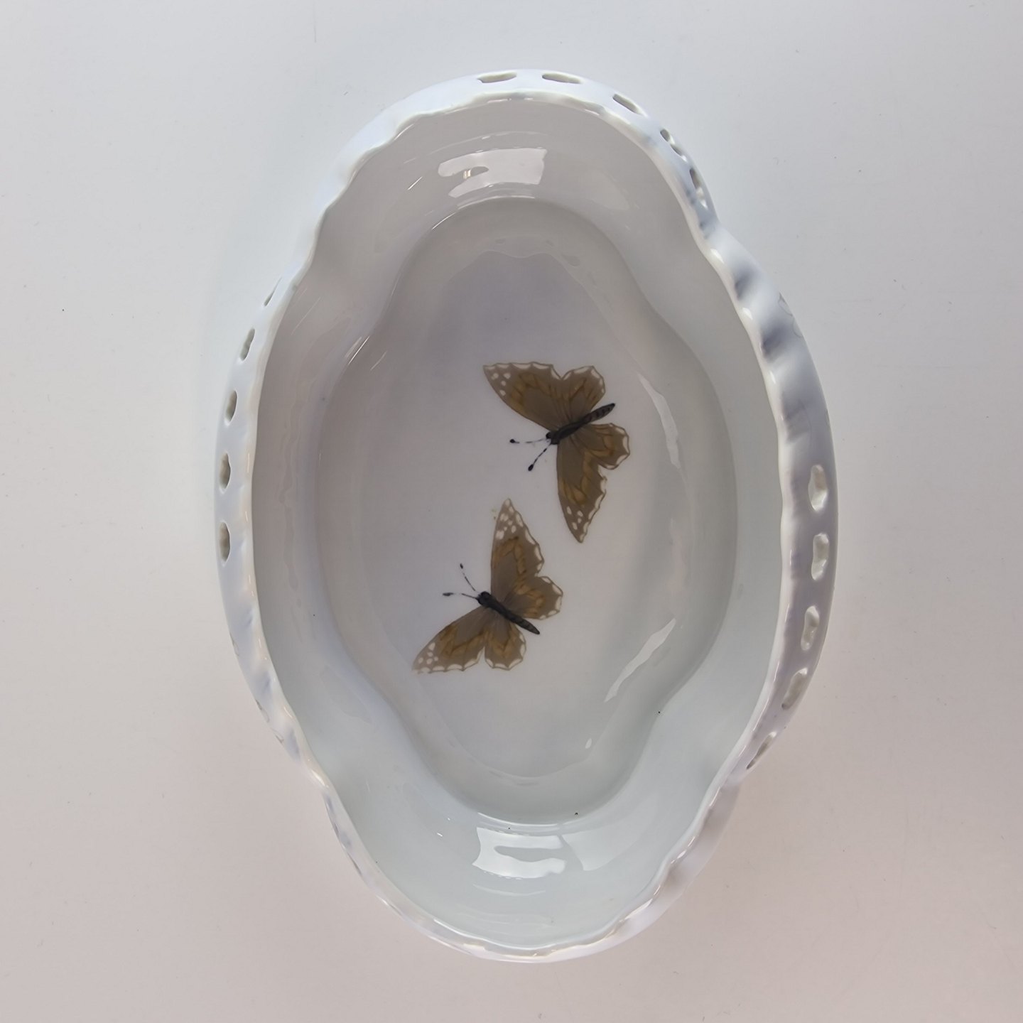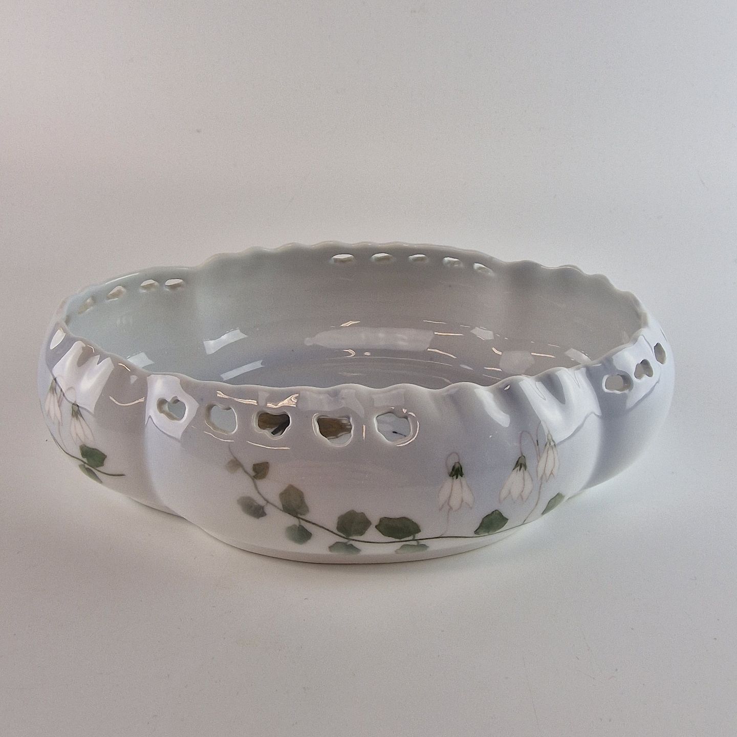 Art Nouveau skål med gennembrudt kant. Dekoreret med vintergækker og sommerfugle. No 12/9528