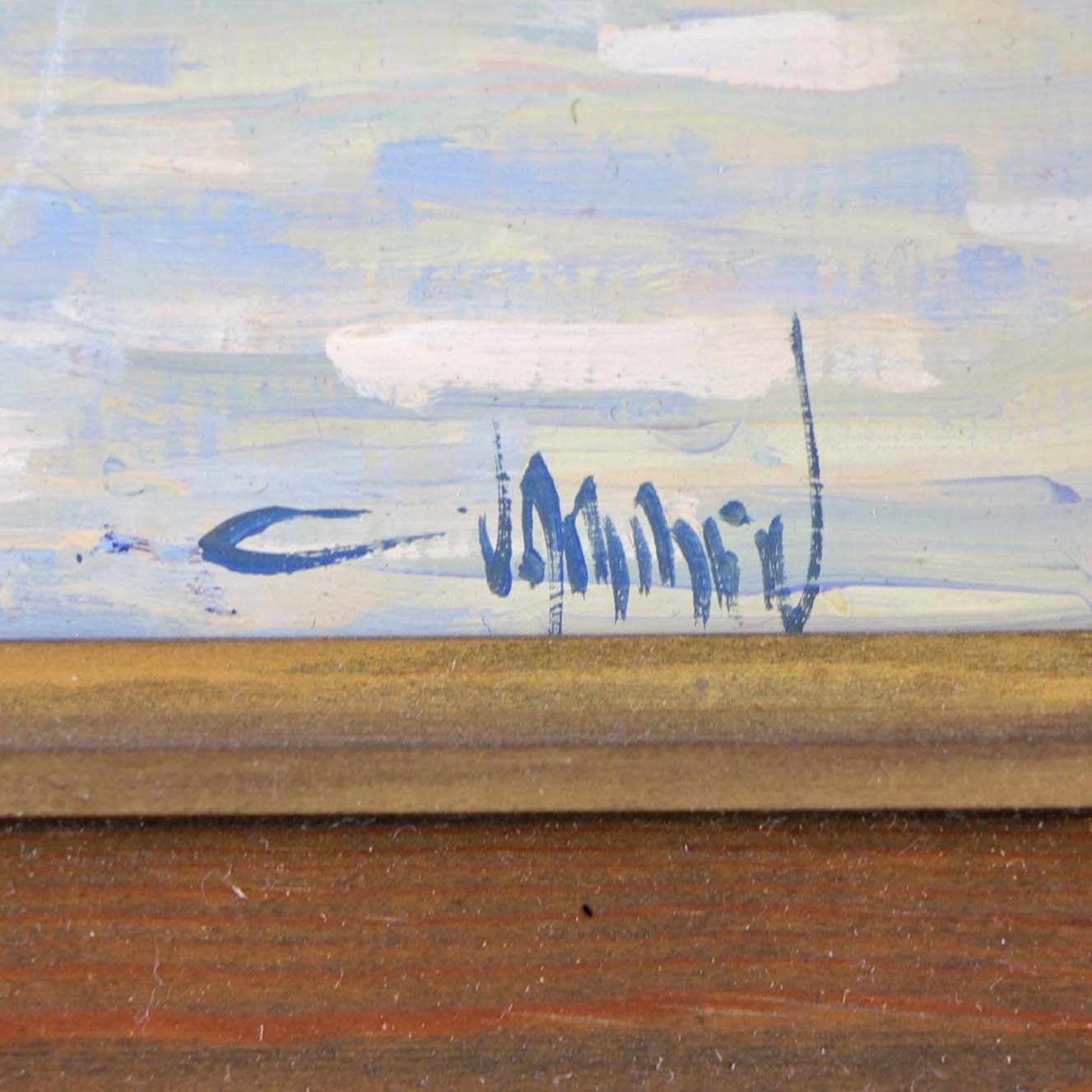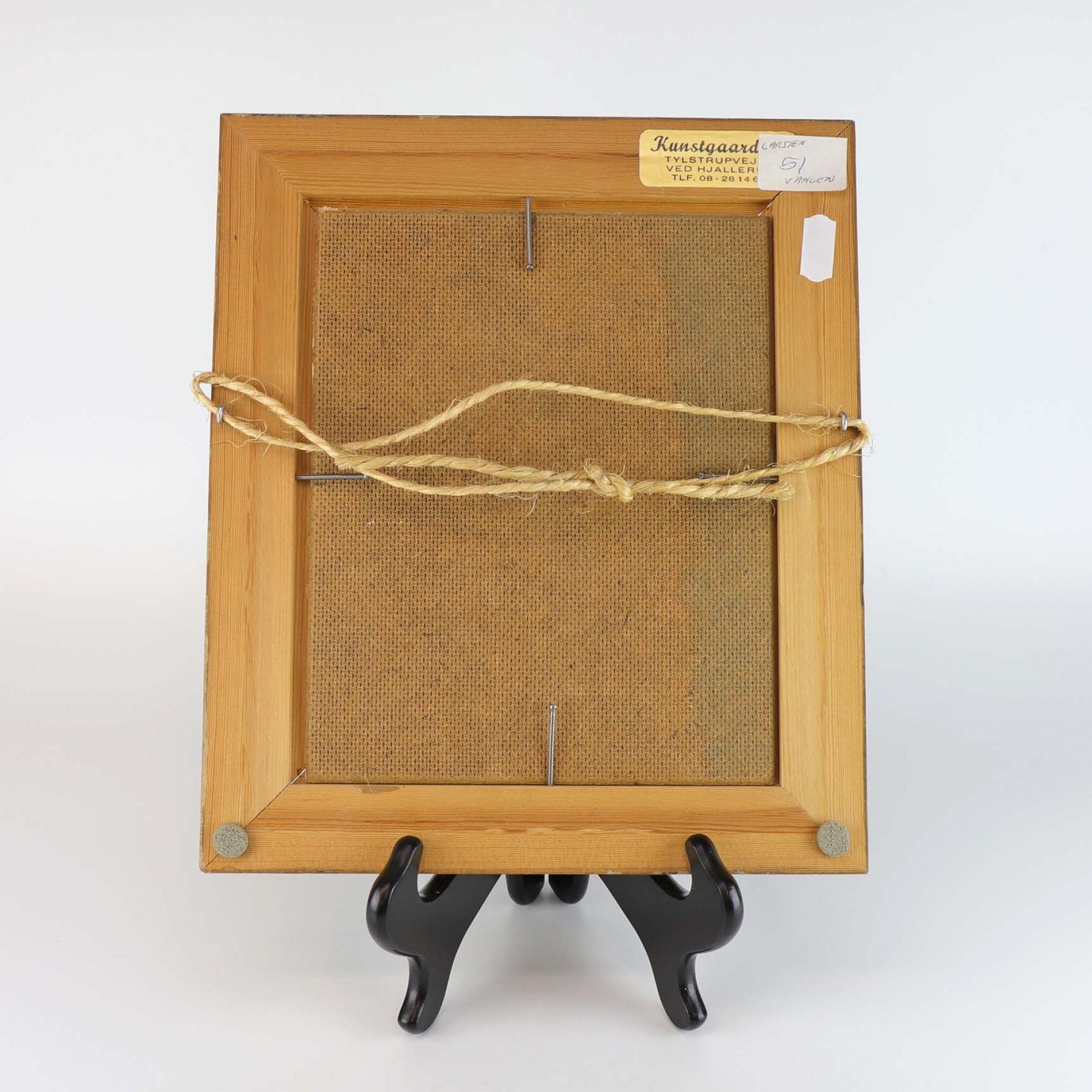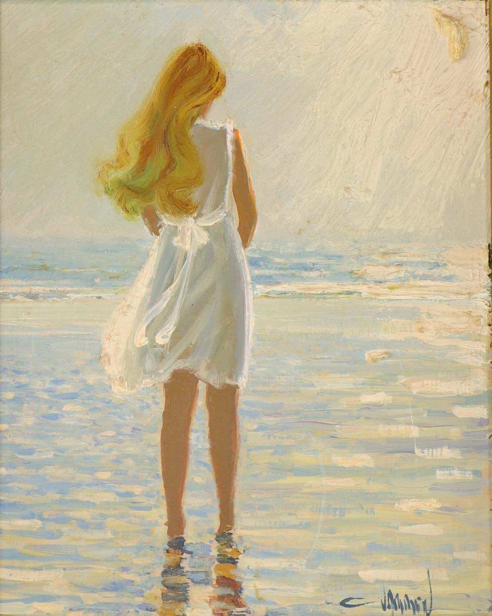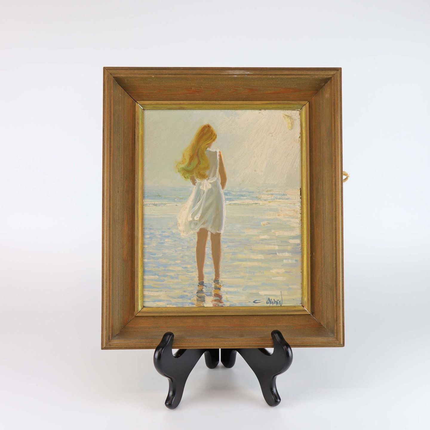 Oliemaleri på plade med træramme. Portrætmaleri set bagfra af lyshåret pige, som står i vandkanten