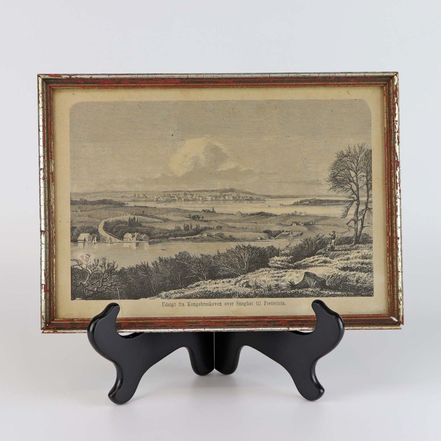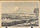 Stålstik med landskabsmotiv med teksten: Udsigten fra Kongebroskoven over Snohøj til Fredericia.