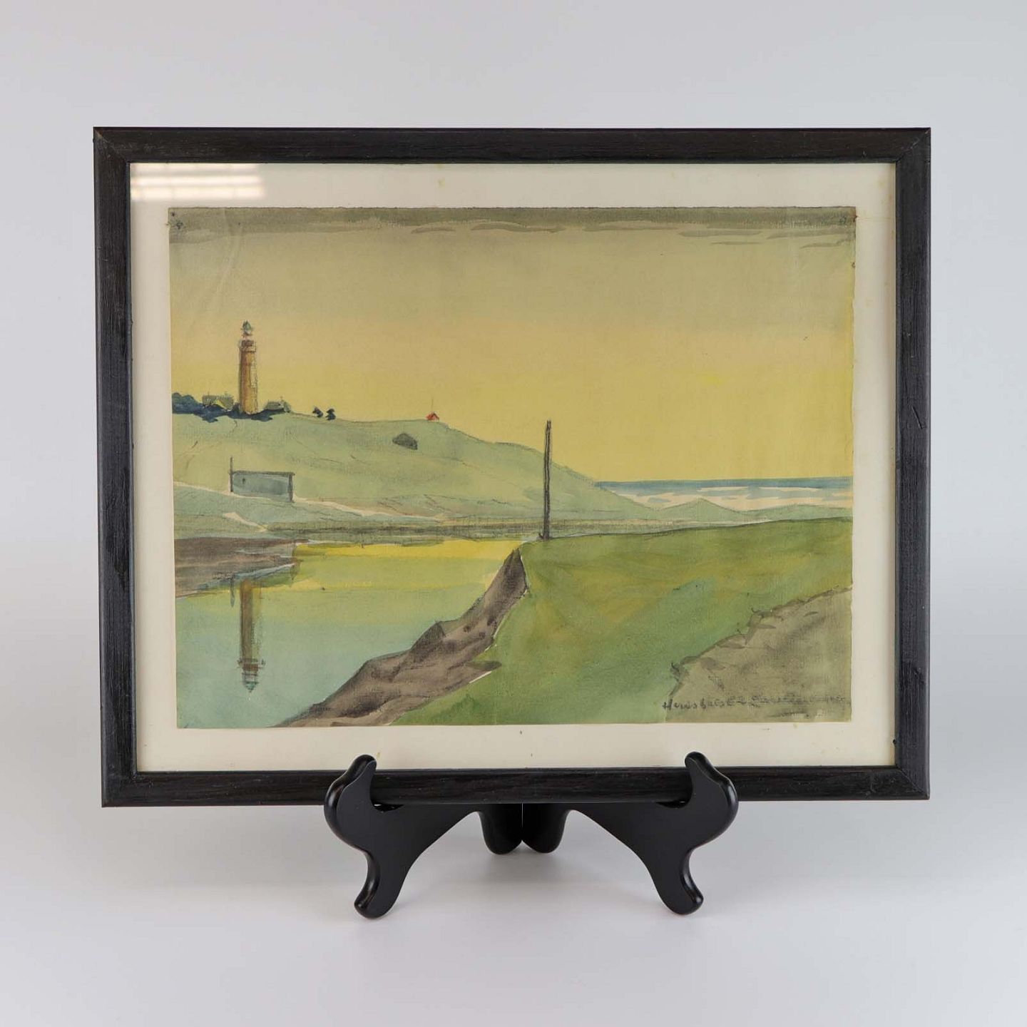 Indrammet akvarel på papir i ramme med motiv af fyrtårn ved Hansholm strand