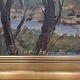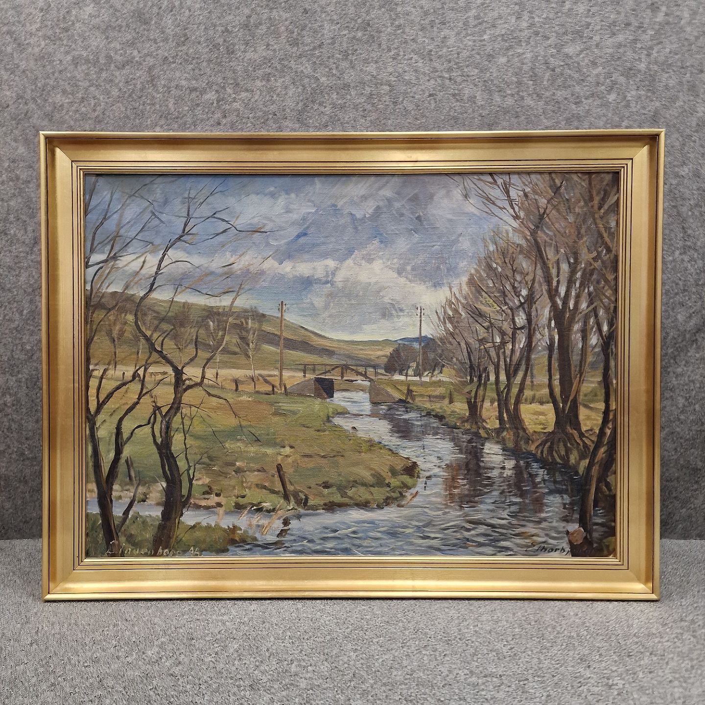 Maleri af landskab med å og bro. Titel "Lindenborg aa".