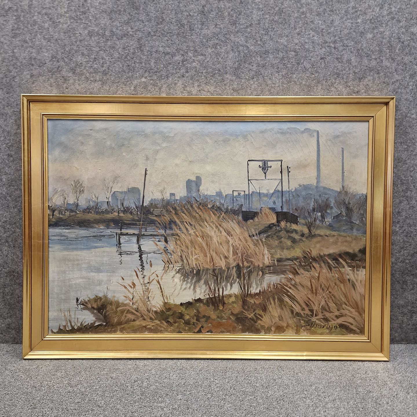 Maleri af vand med storby i baggrunden, formentlig Aalborg Teglværk