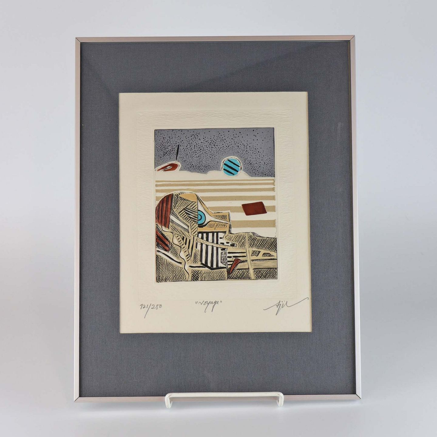 Glasindrammet abstrakt litografisk tryk på struktureret papir monteret på grå stofbaggrund. Navngivet Voyage. Nr 121/250