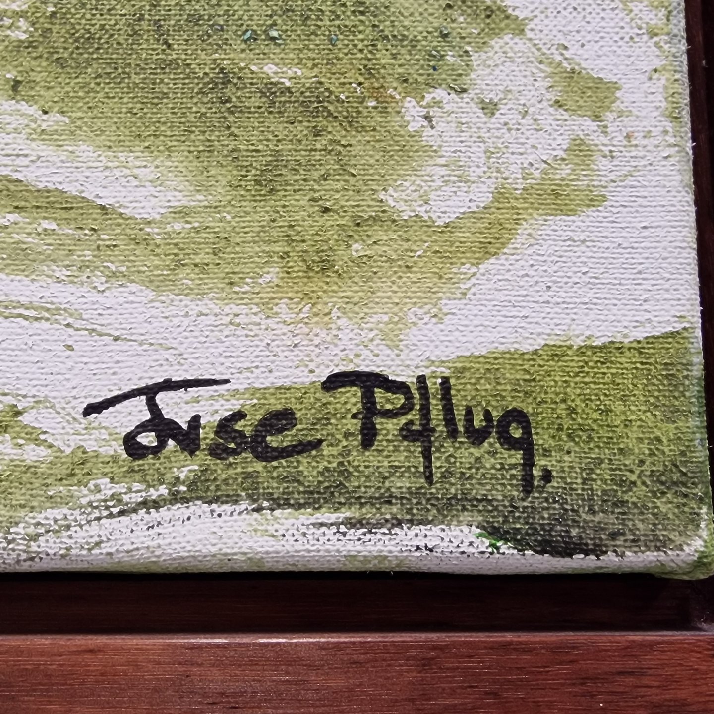 Oliemaleri på lærred med træramme. Landskabsmaleri med motiv af eng med viber stående i forgrunden