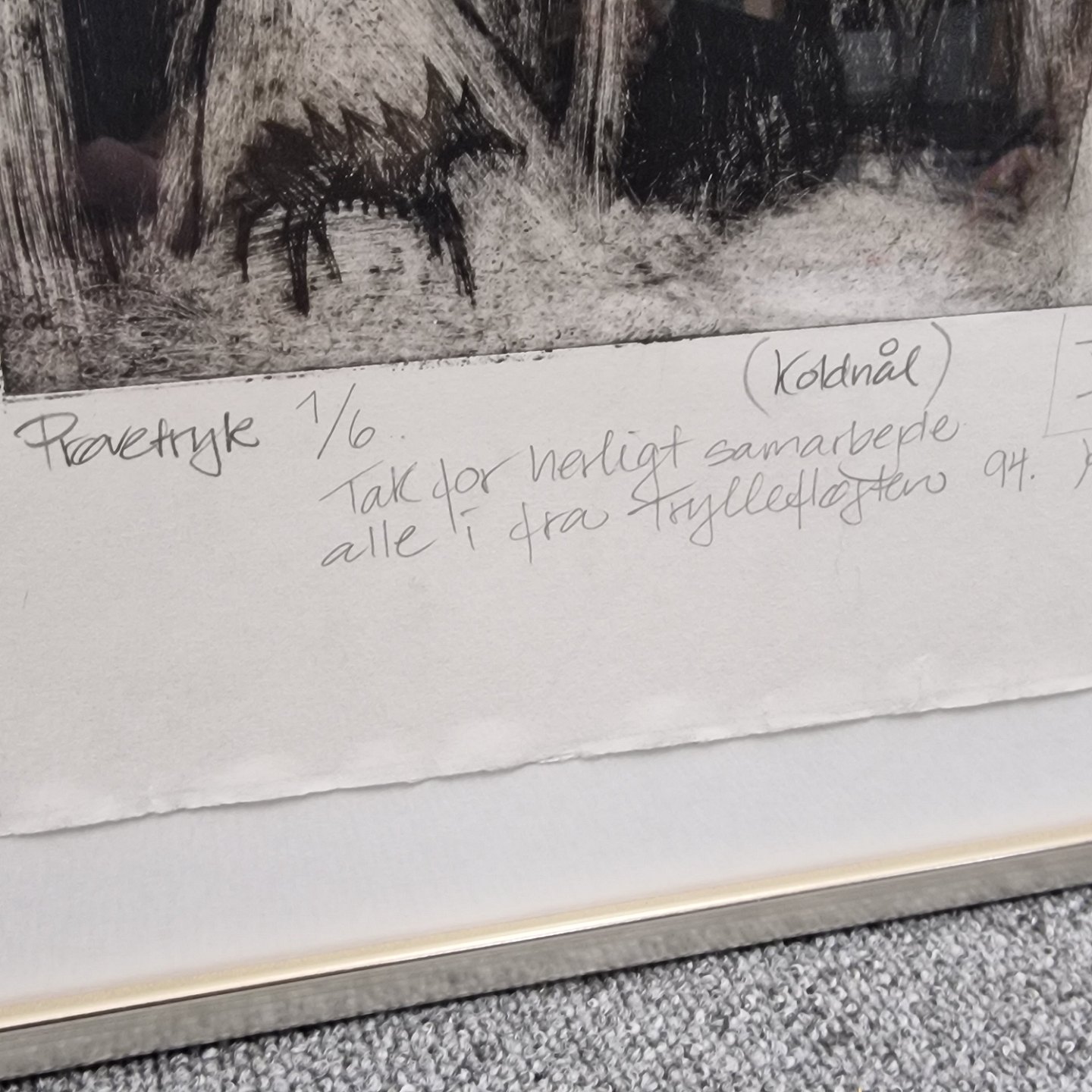 Prøvetryk med titlen Transmission fra år 1993. Nederst en personlig hilsen til alle i Tryllefløjten år 1994