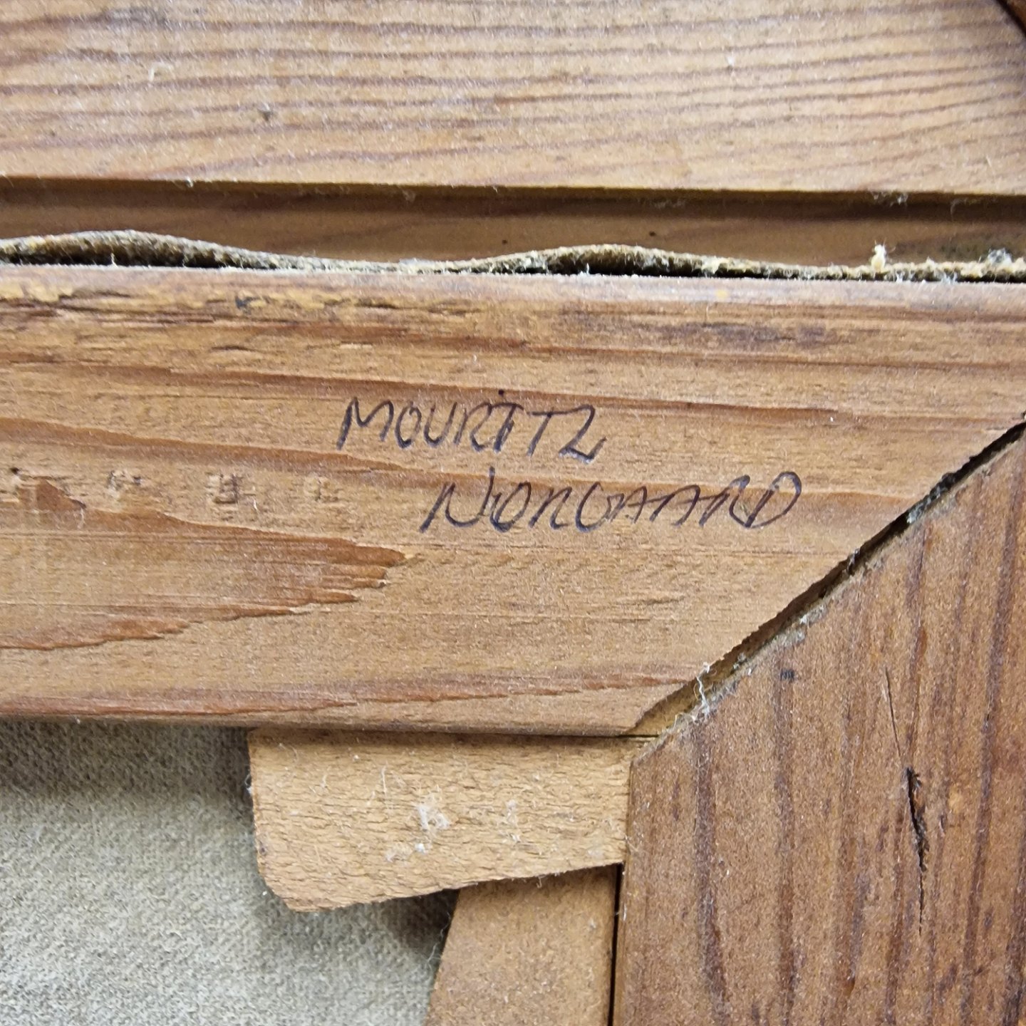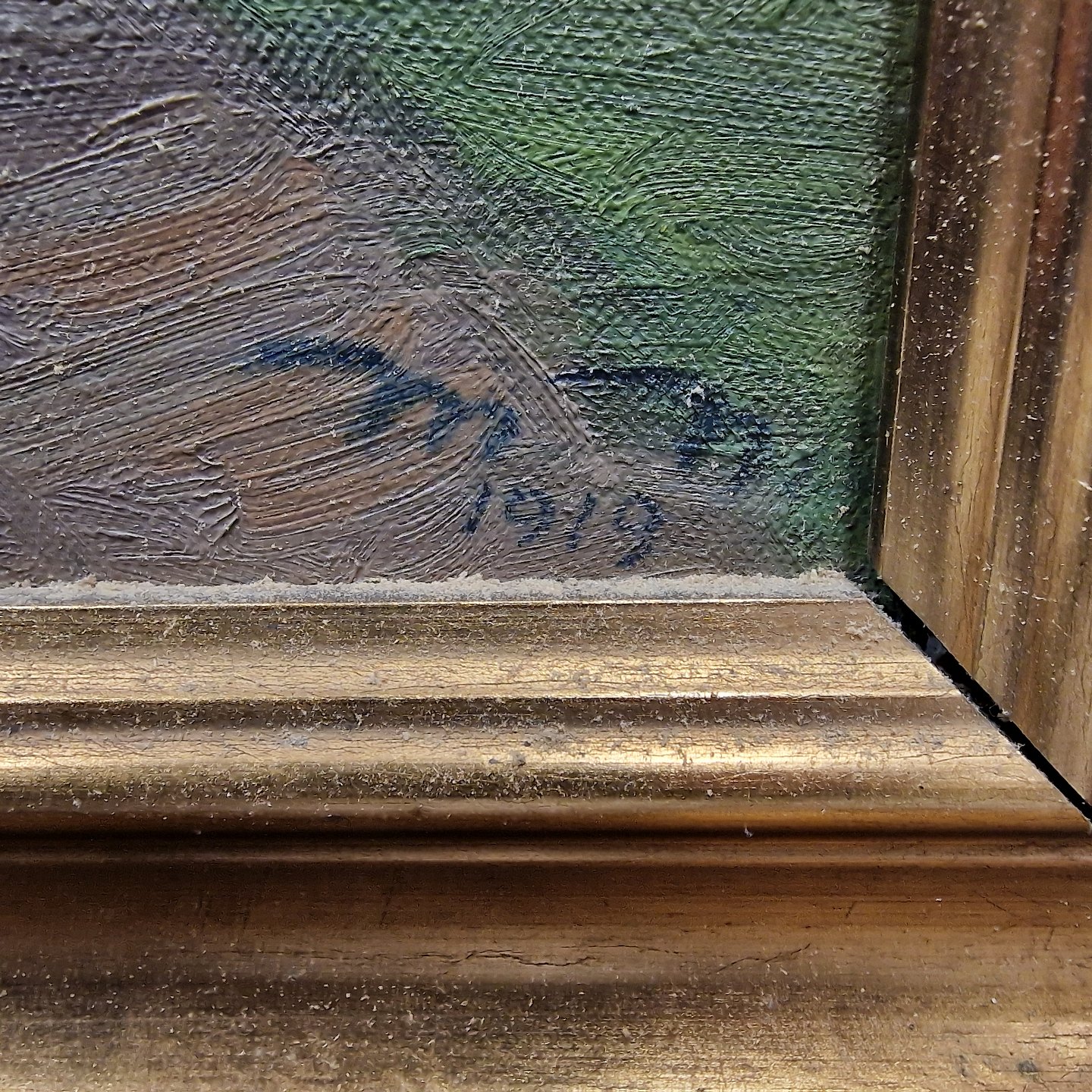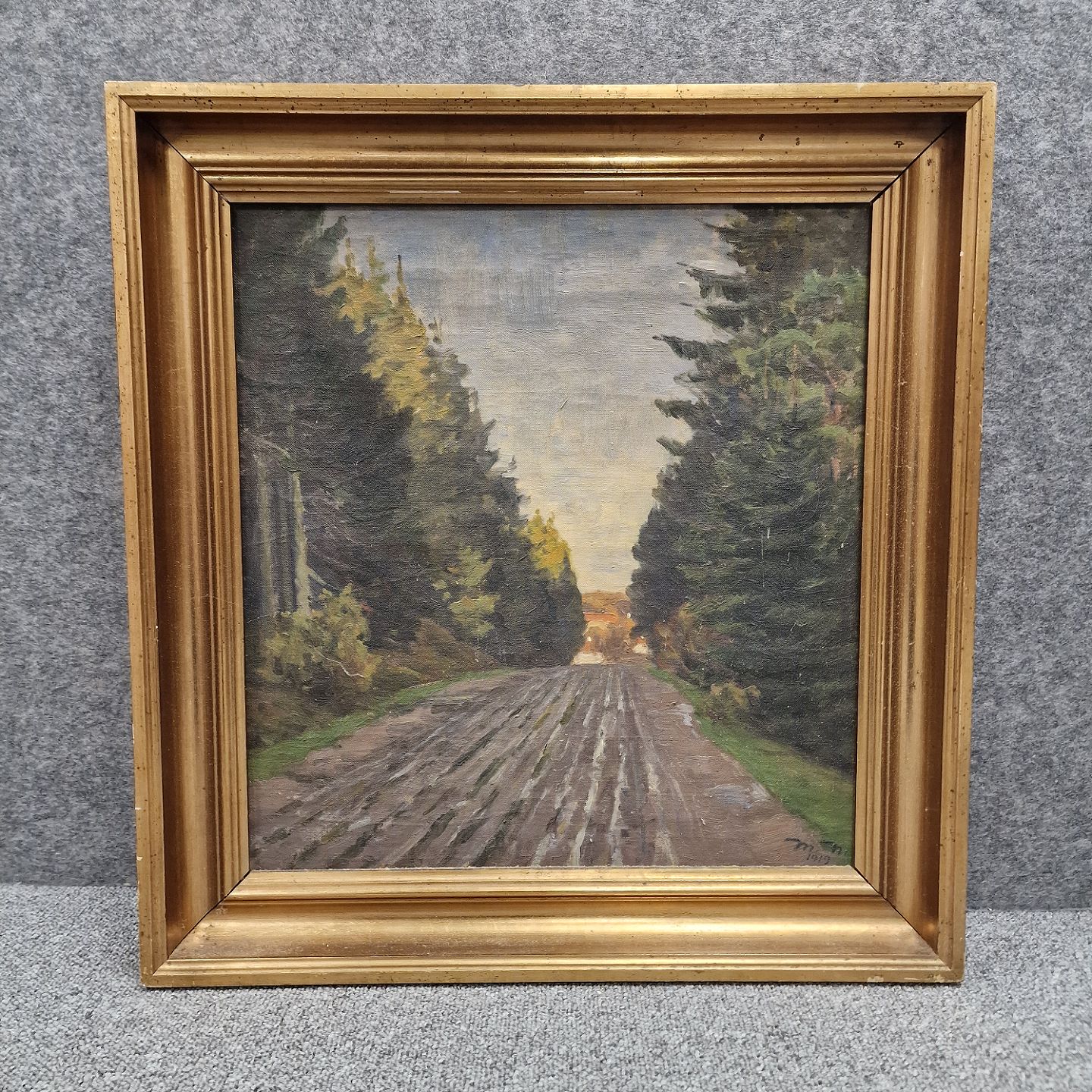 Maleri på lærred med motiv af en vej igennem skov. Dateret 1919