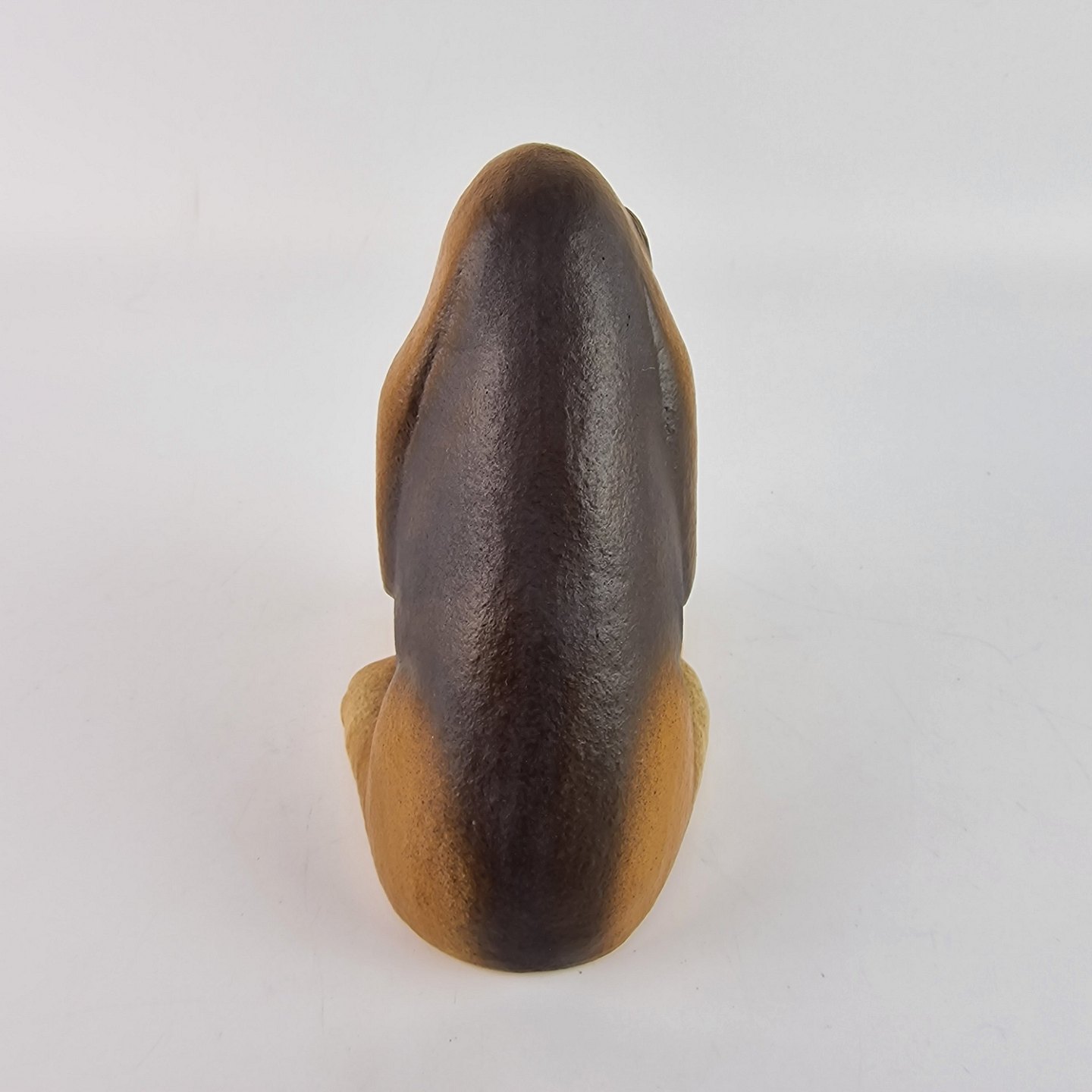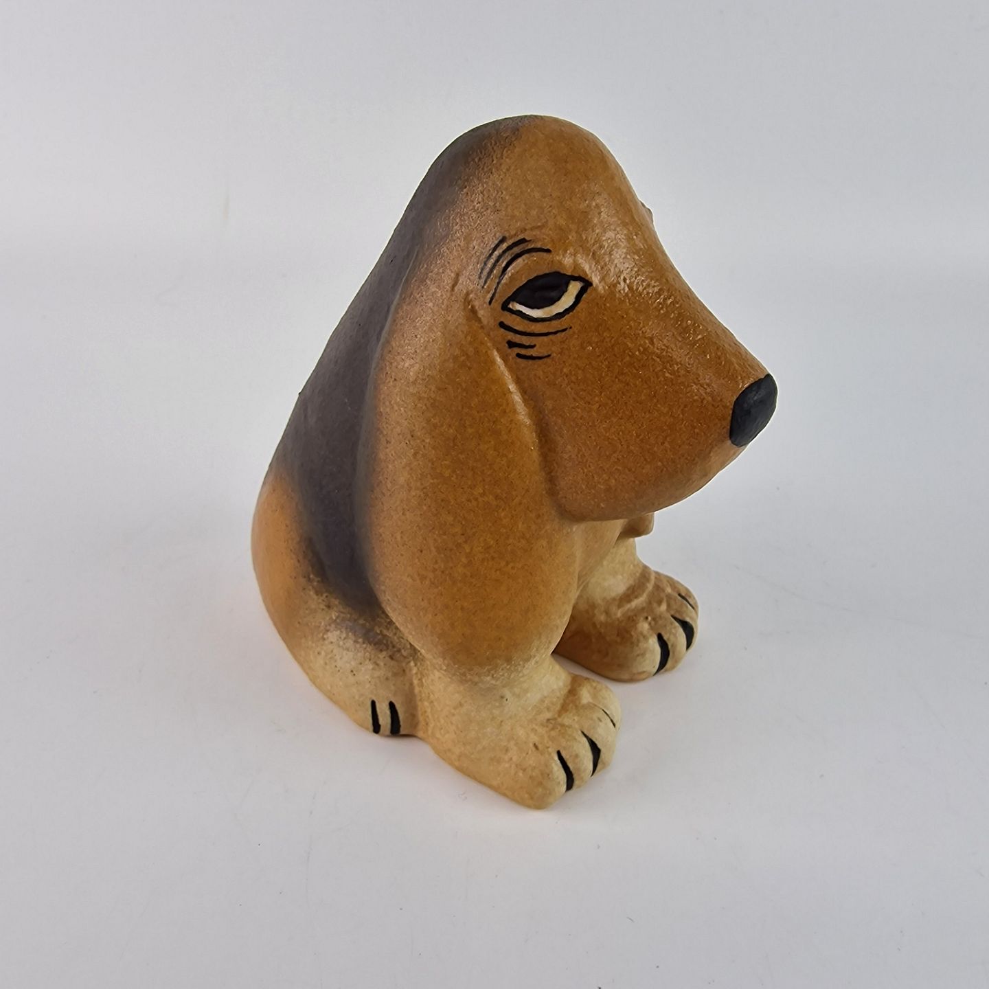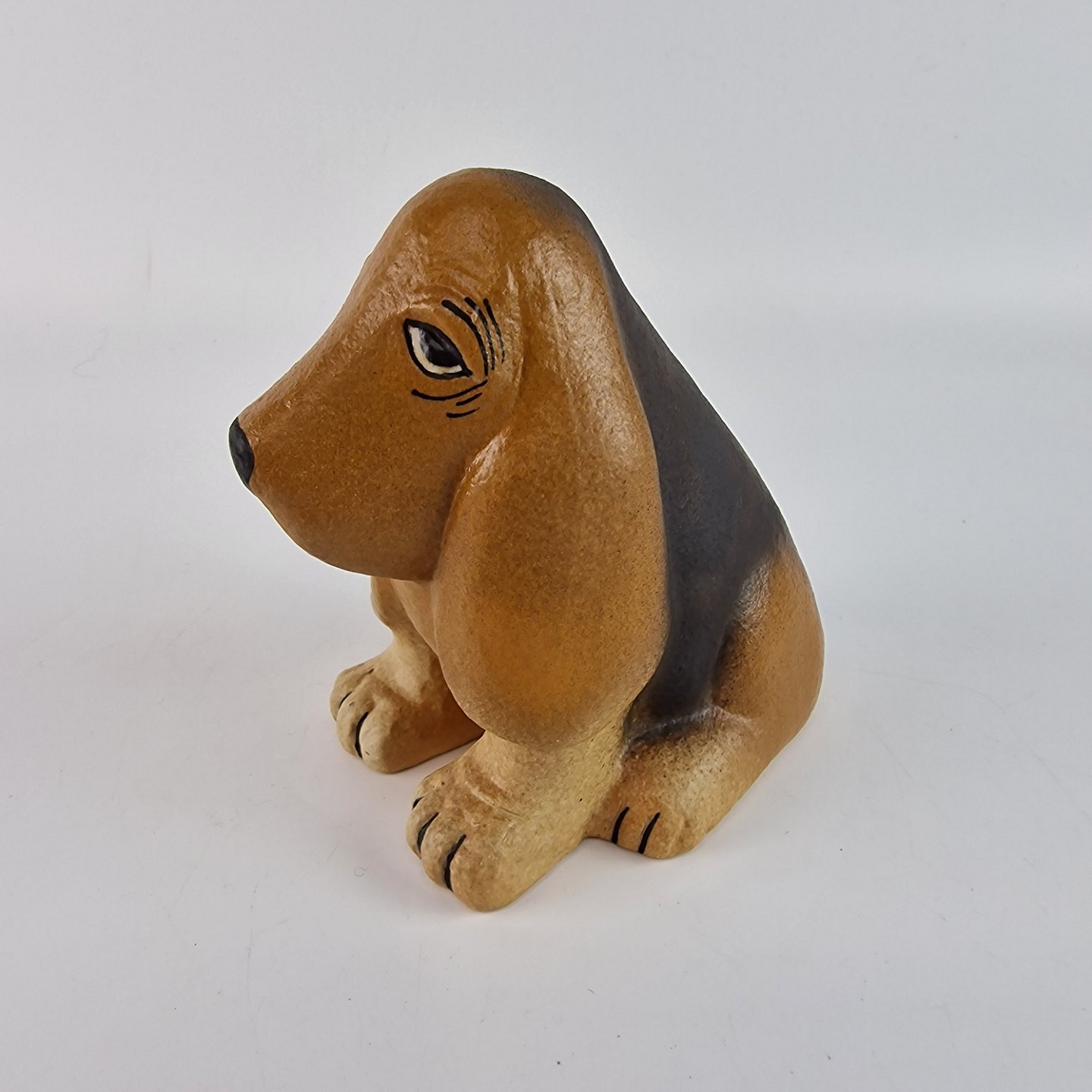 Keramikfigur af en hånddekoreret bassethund med navnet Brainy Basset. Designet i 1990'erne