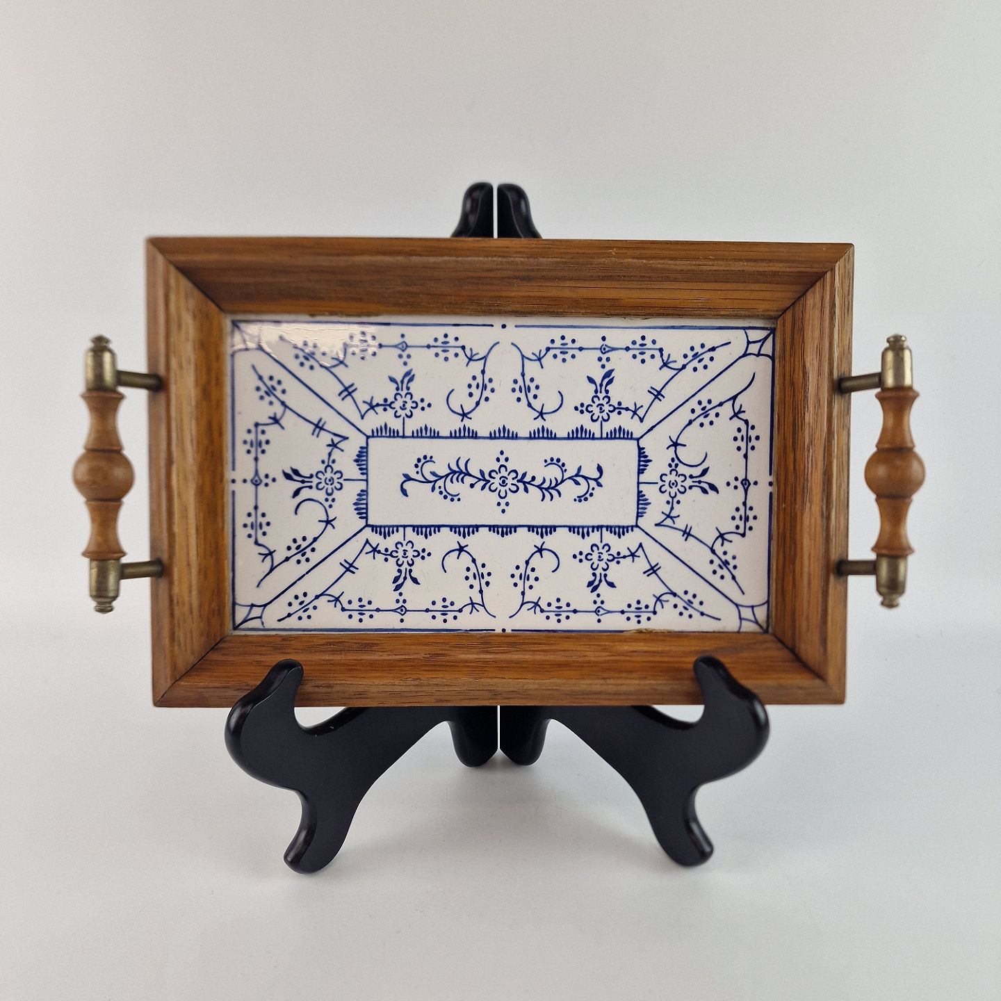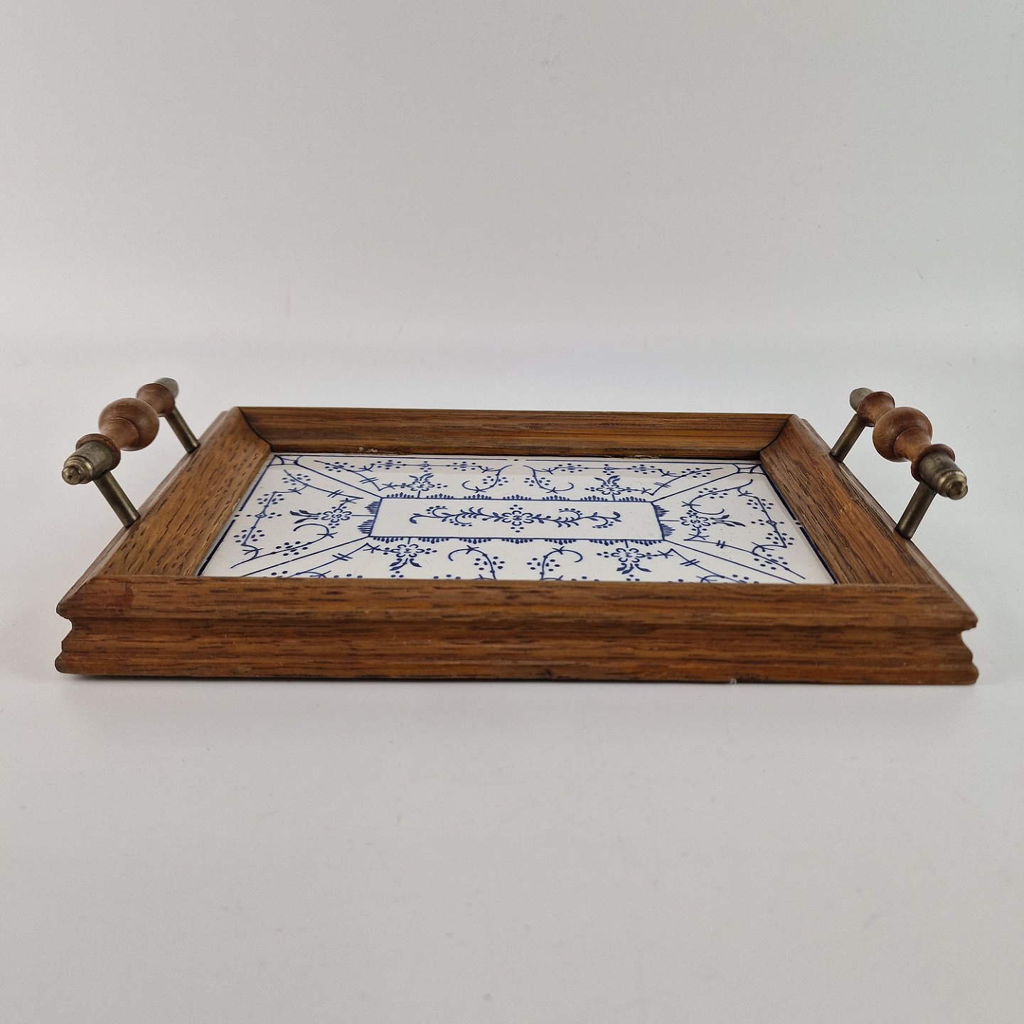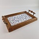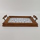 Bakke med ramme af træ og bund af porcelæn med blåt mønster