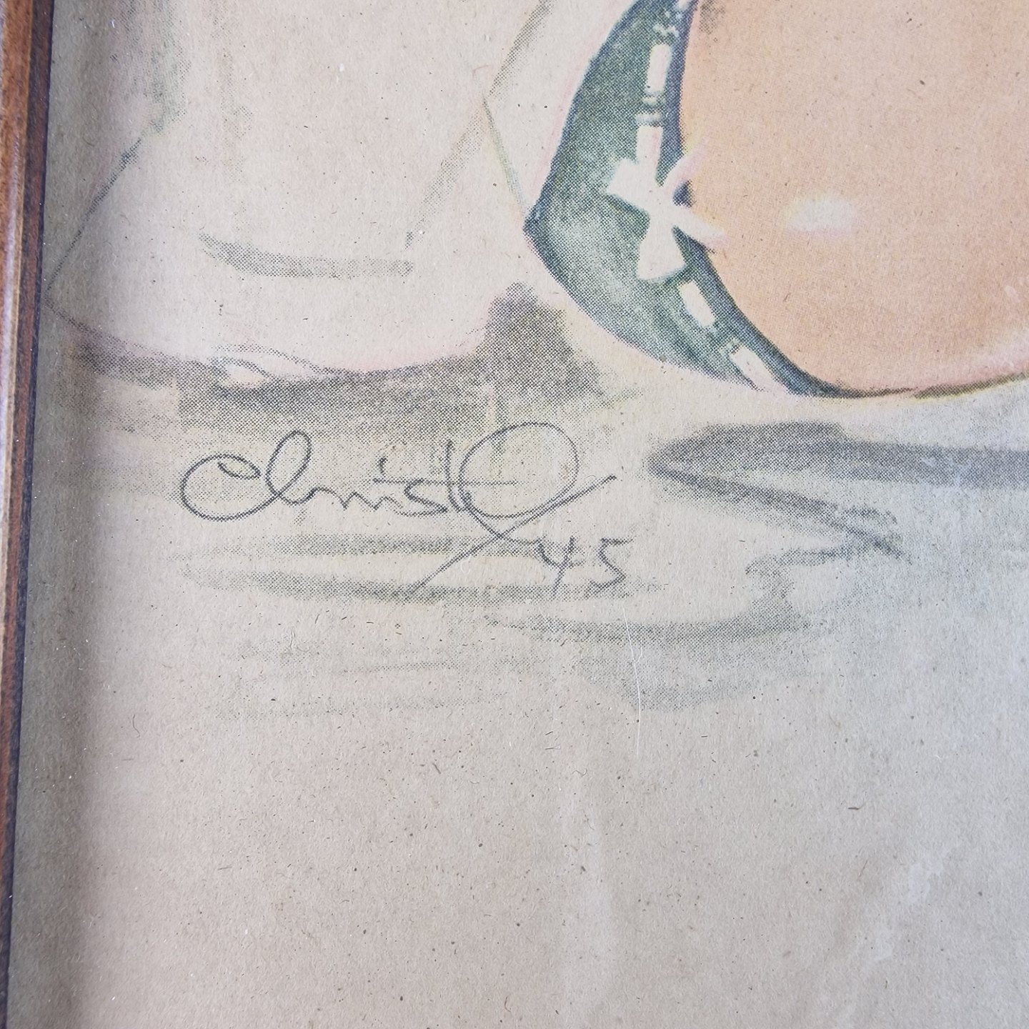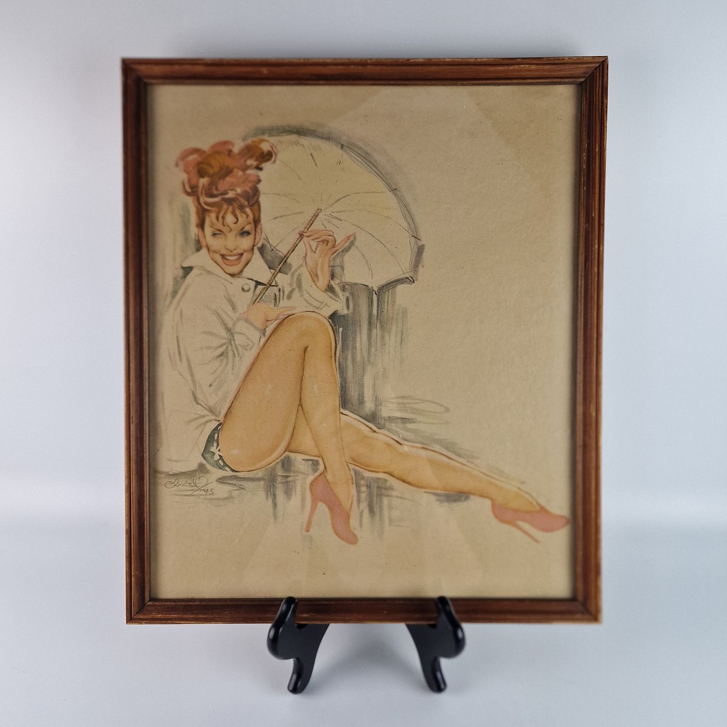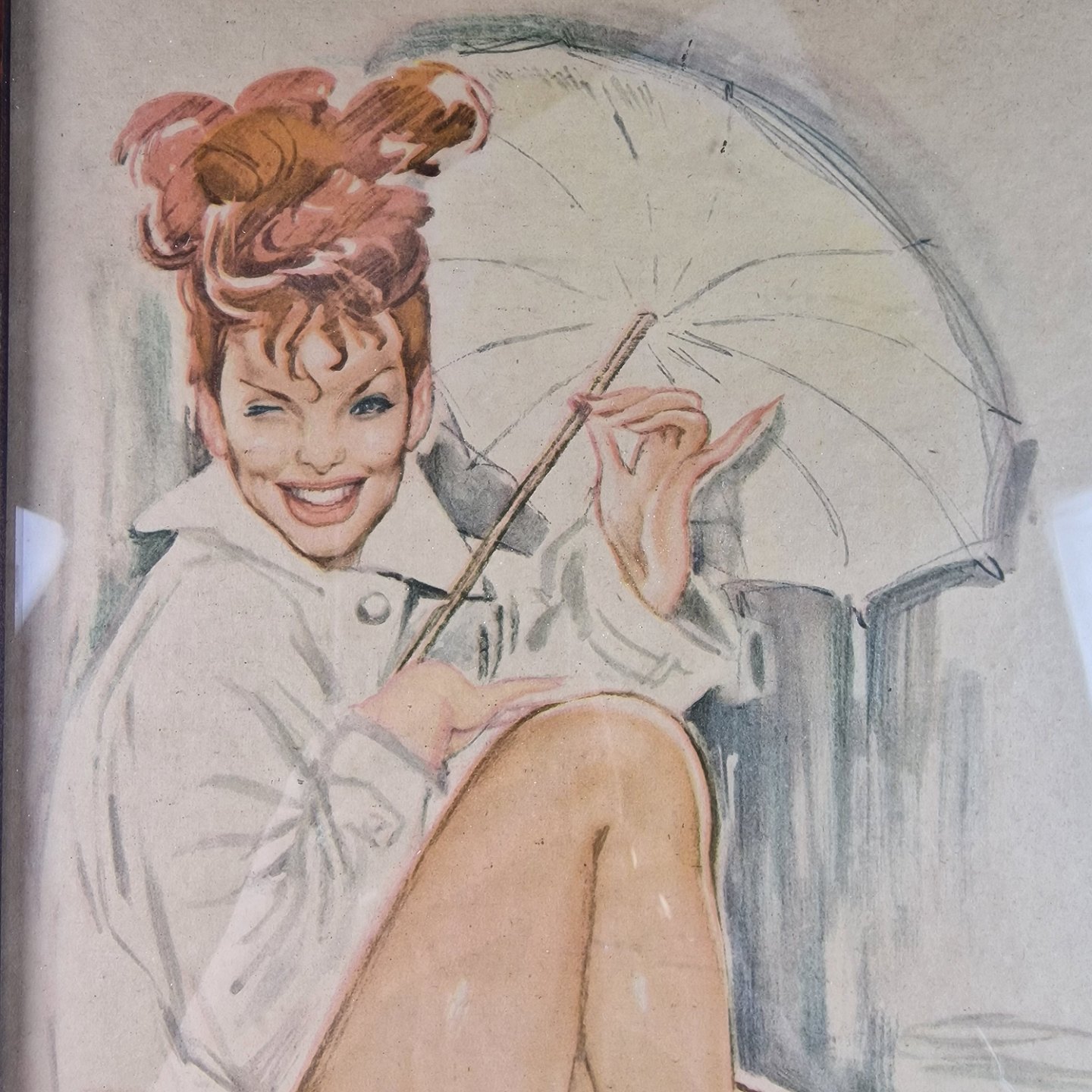 Tryk af en kvinde med røde sko og paraply. Fra 1940'erne