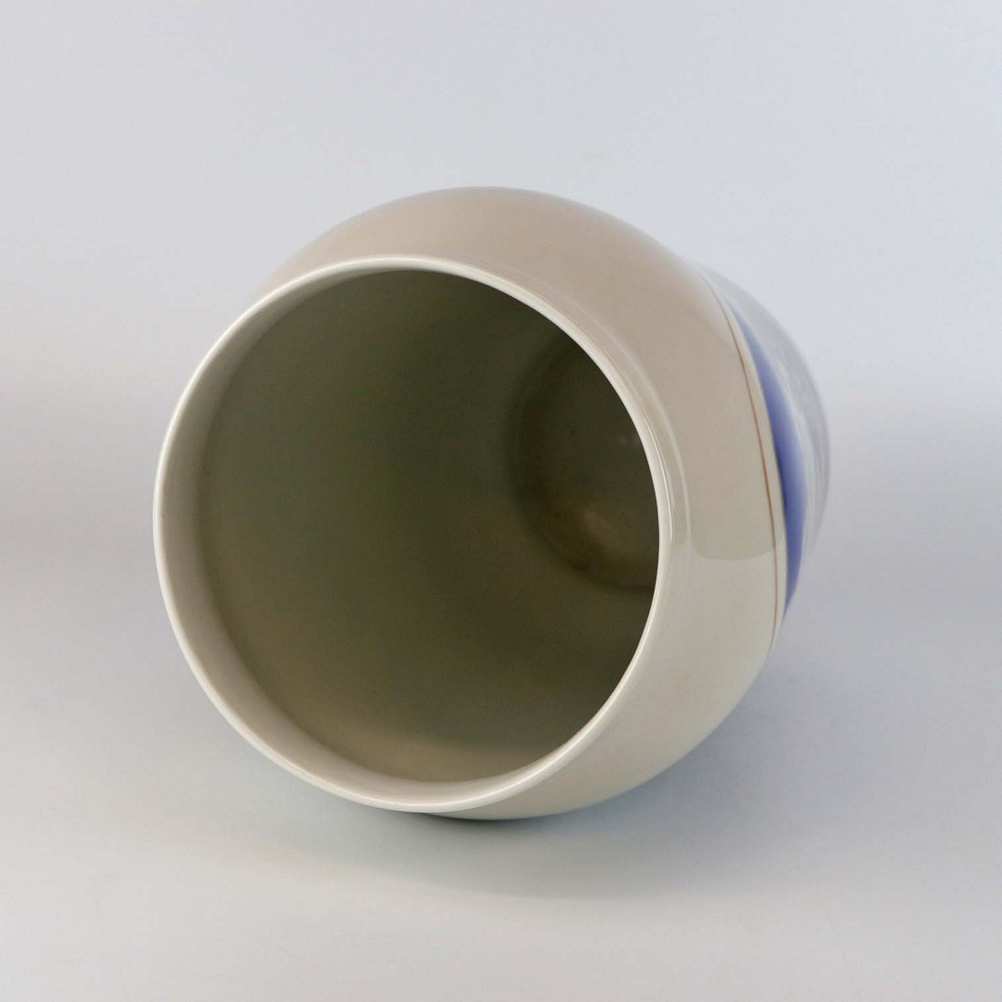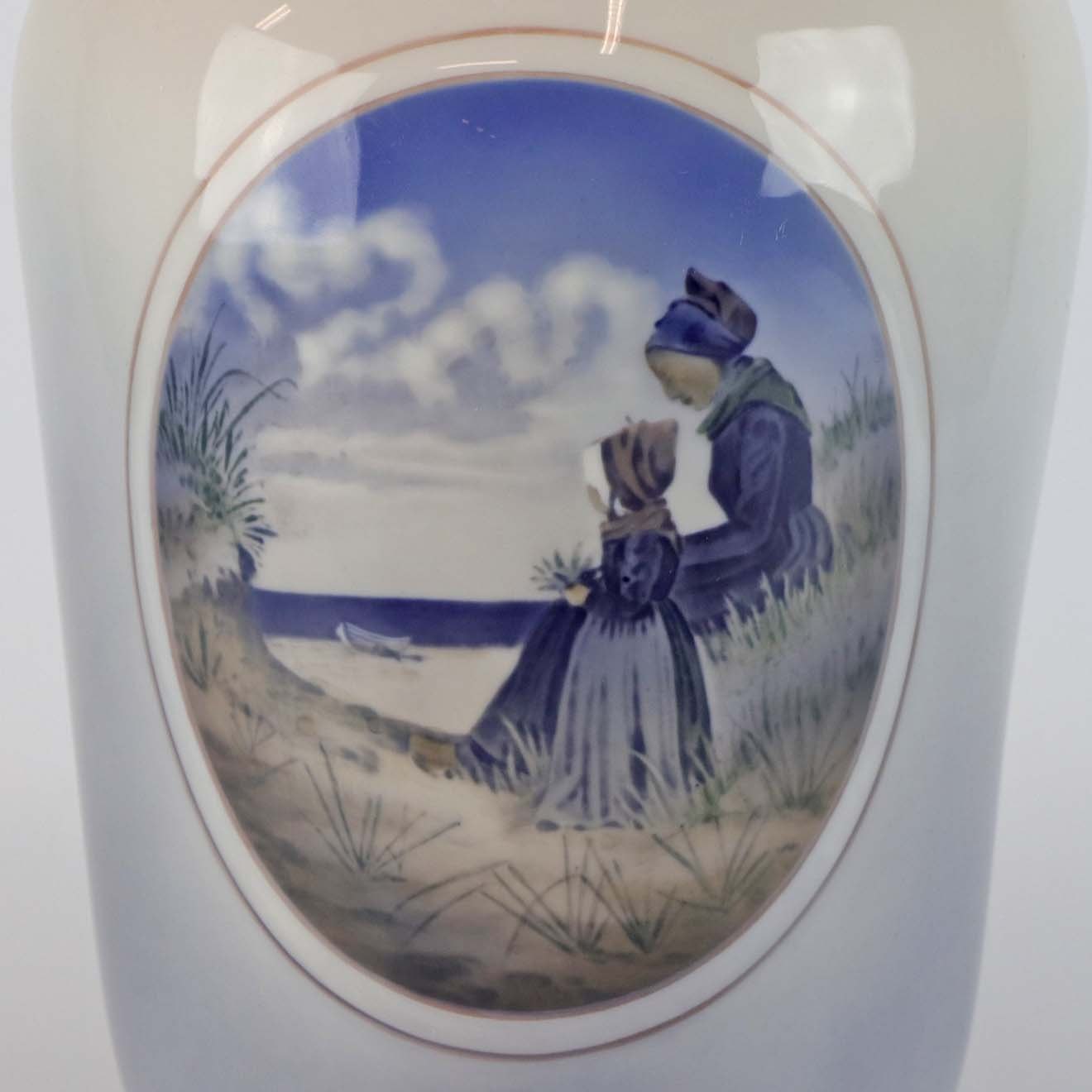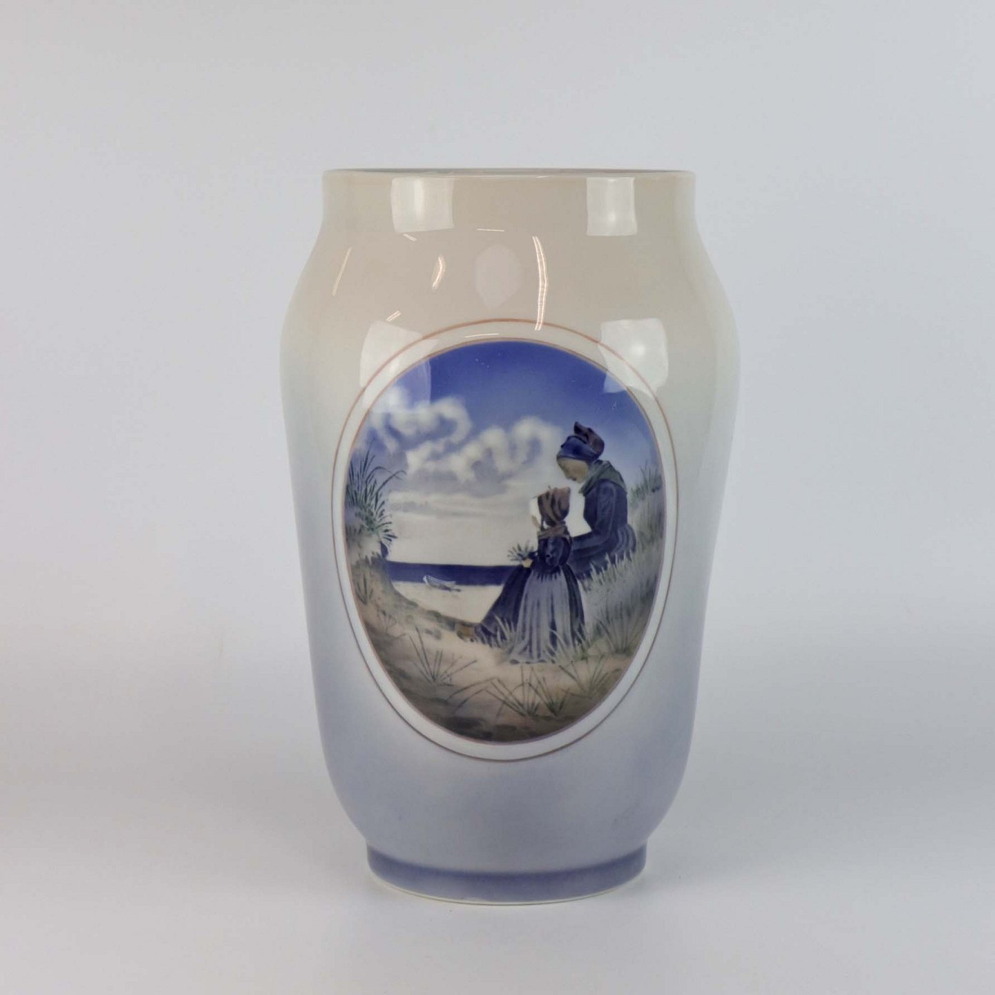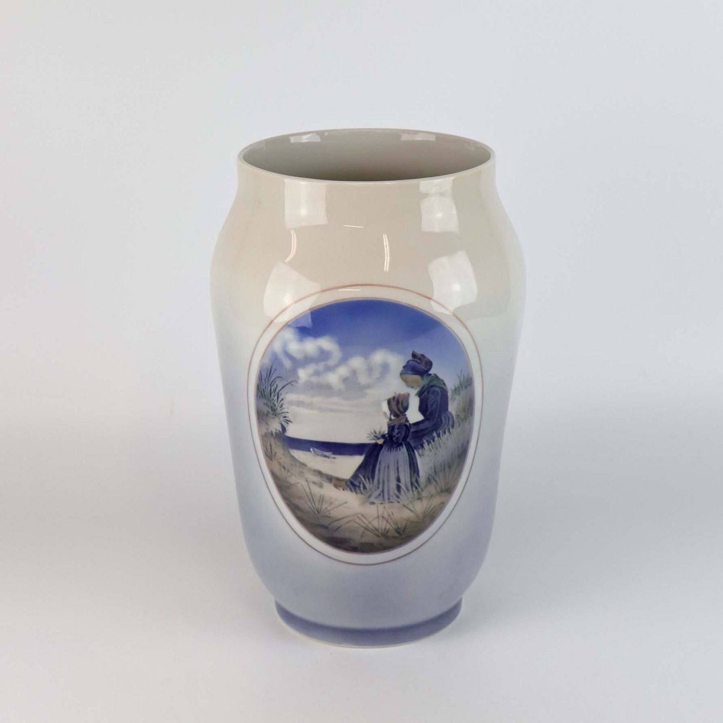 Høj vase i porcelæn med motiv af kvinde og barn i egnsdragter siddende i klitterne ved havet no 4384