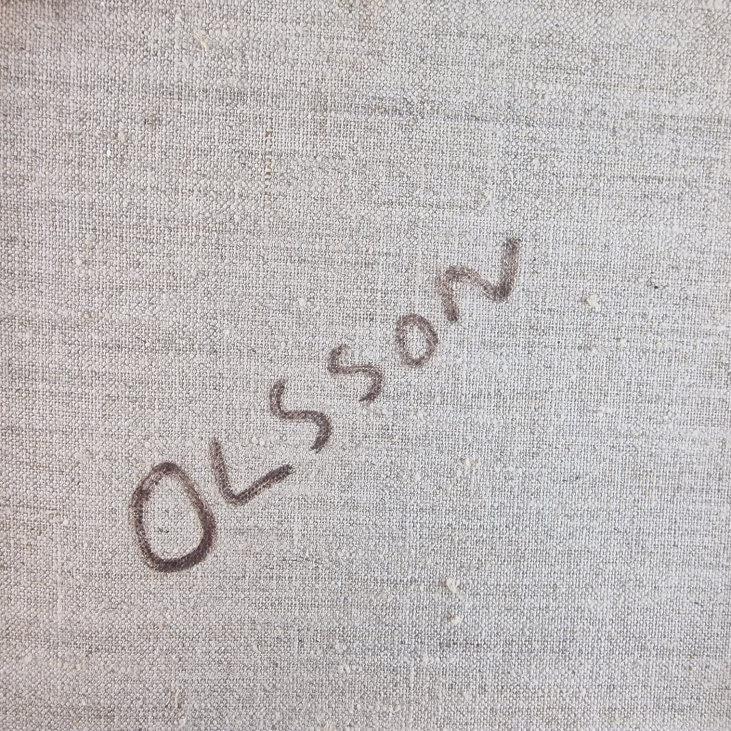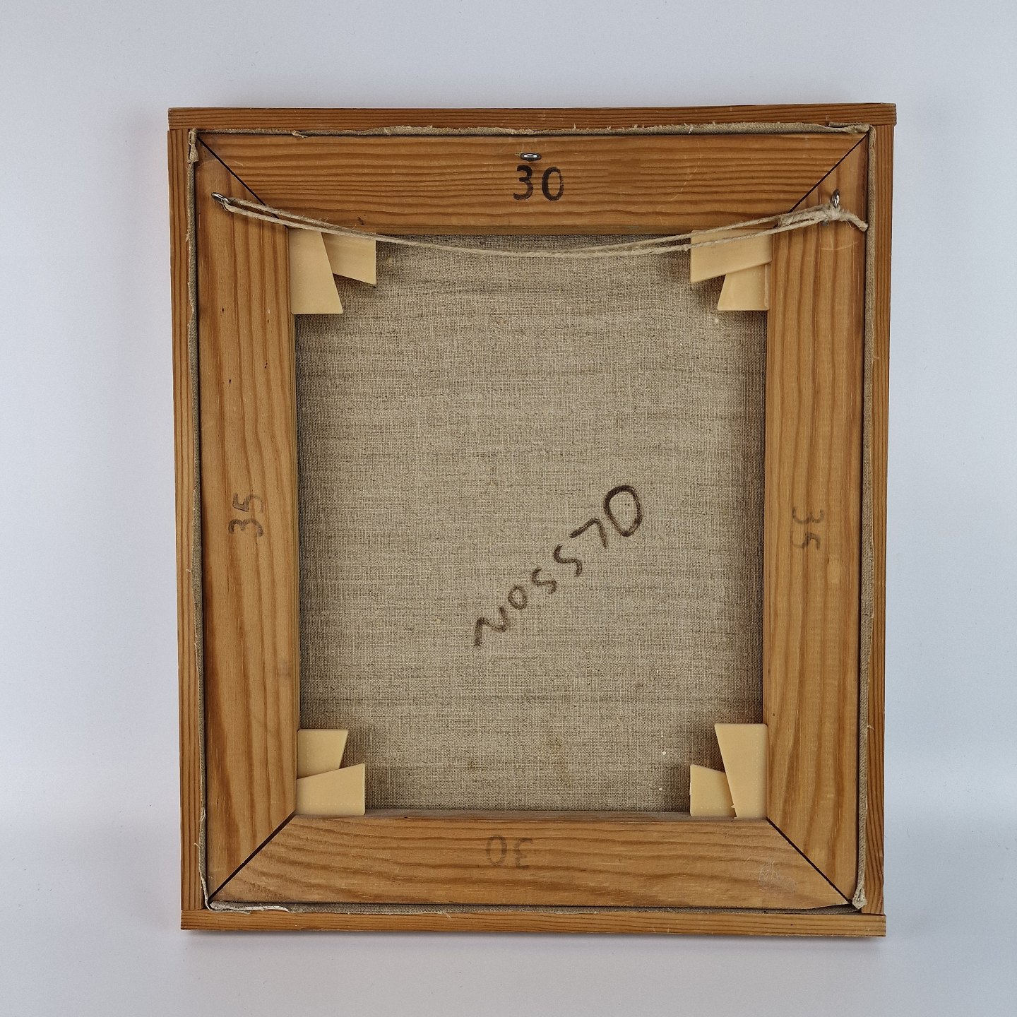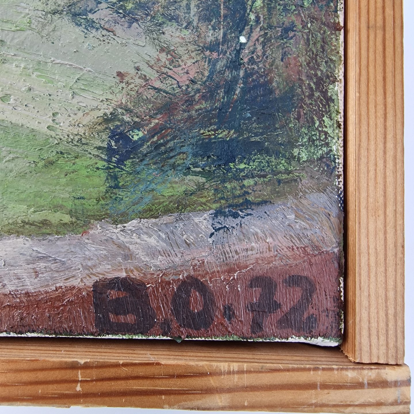 Landskabsmaleri lavet så det er set fra et vindue. Dateret 1972