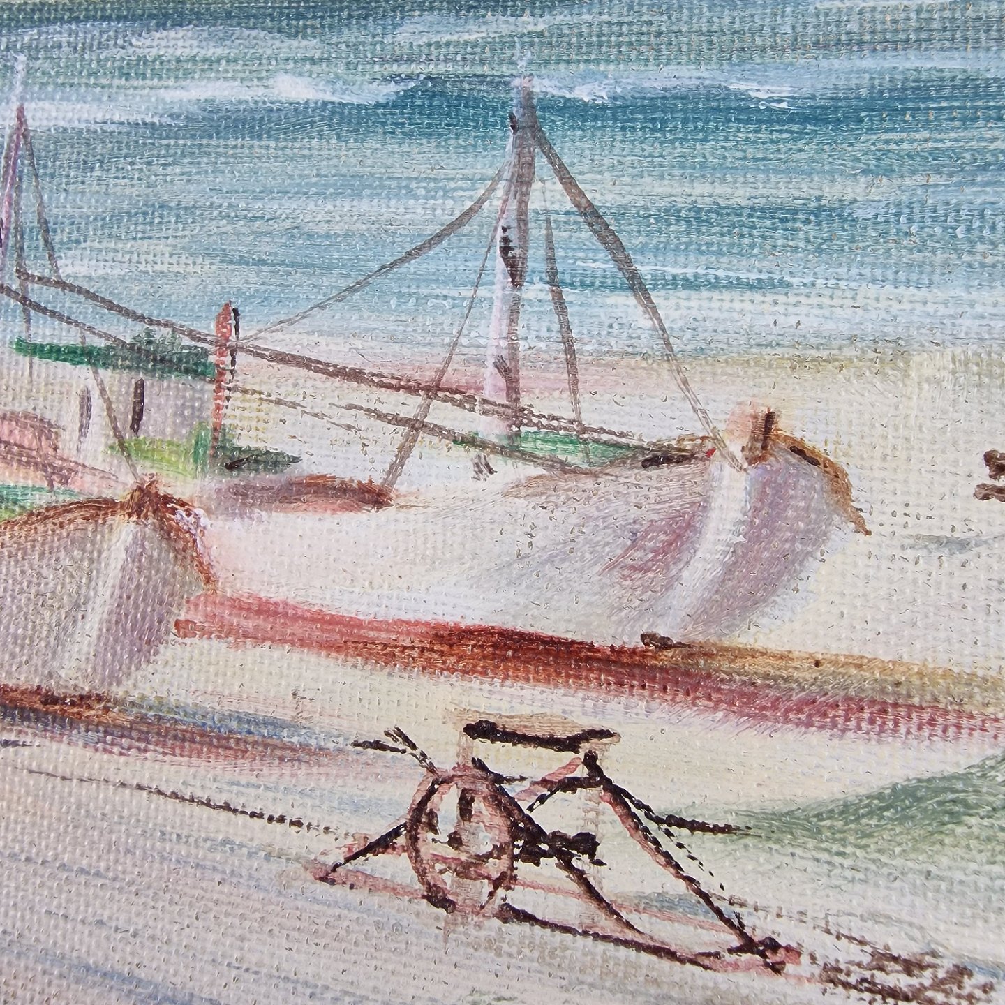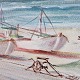 Maleri på lærred med motiv af strand, klitter og både. Løkken