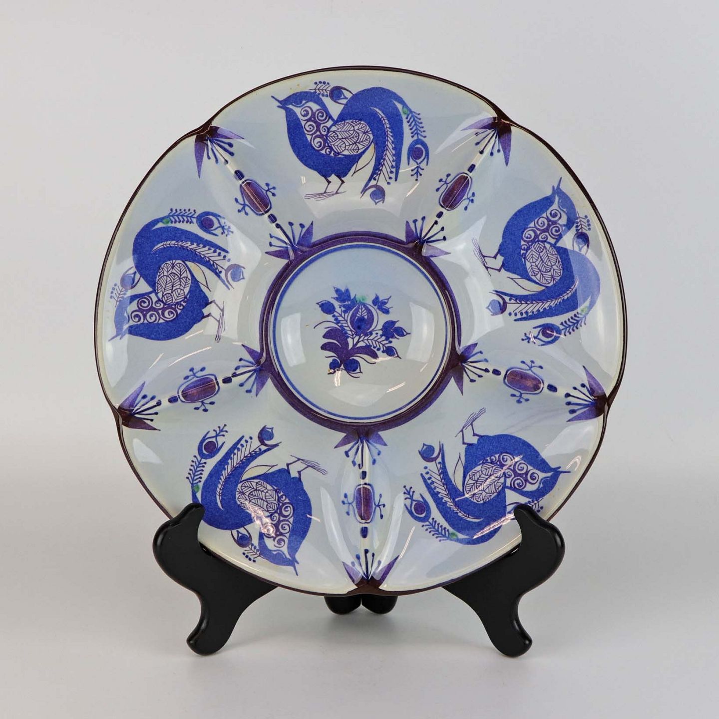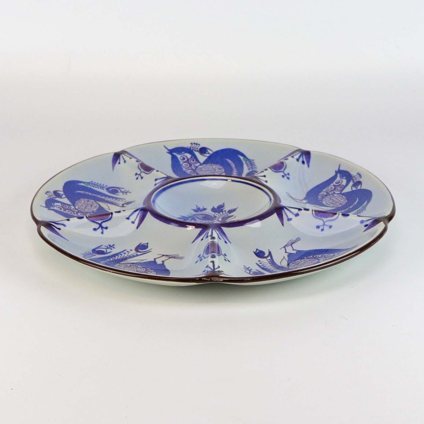 Tenera er af fajance. Stellet er håndmalet med blå påfugle og mønstre i blå og lilla nuancer
