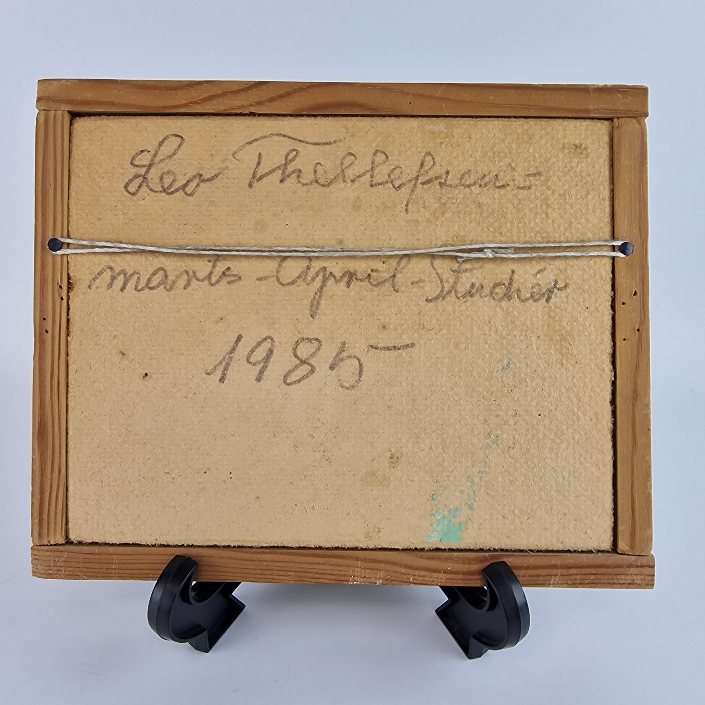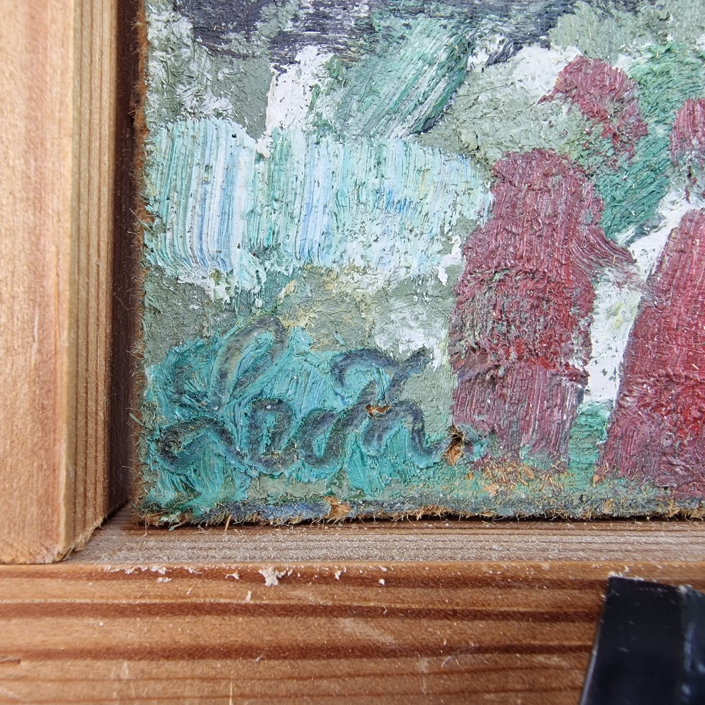 Maleri på lærred med motiv af landskab og kirke. Dateret 1985