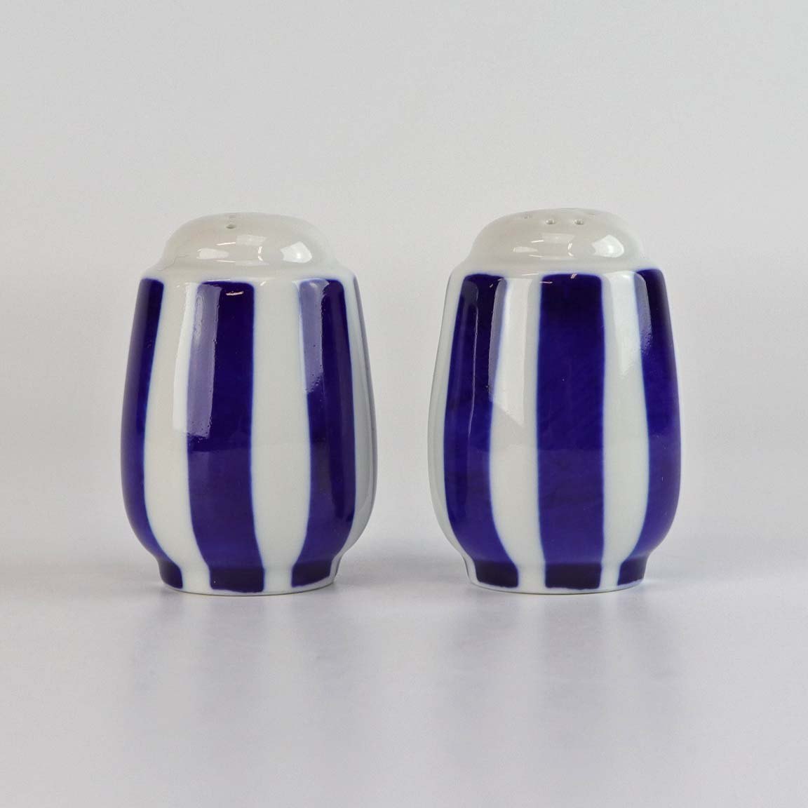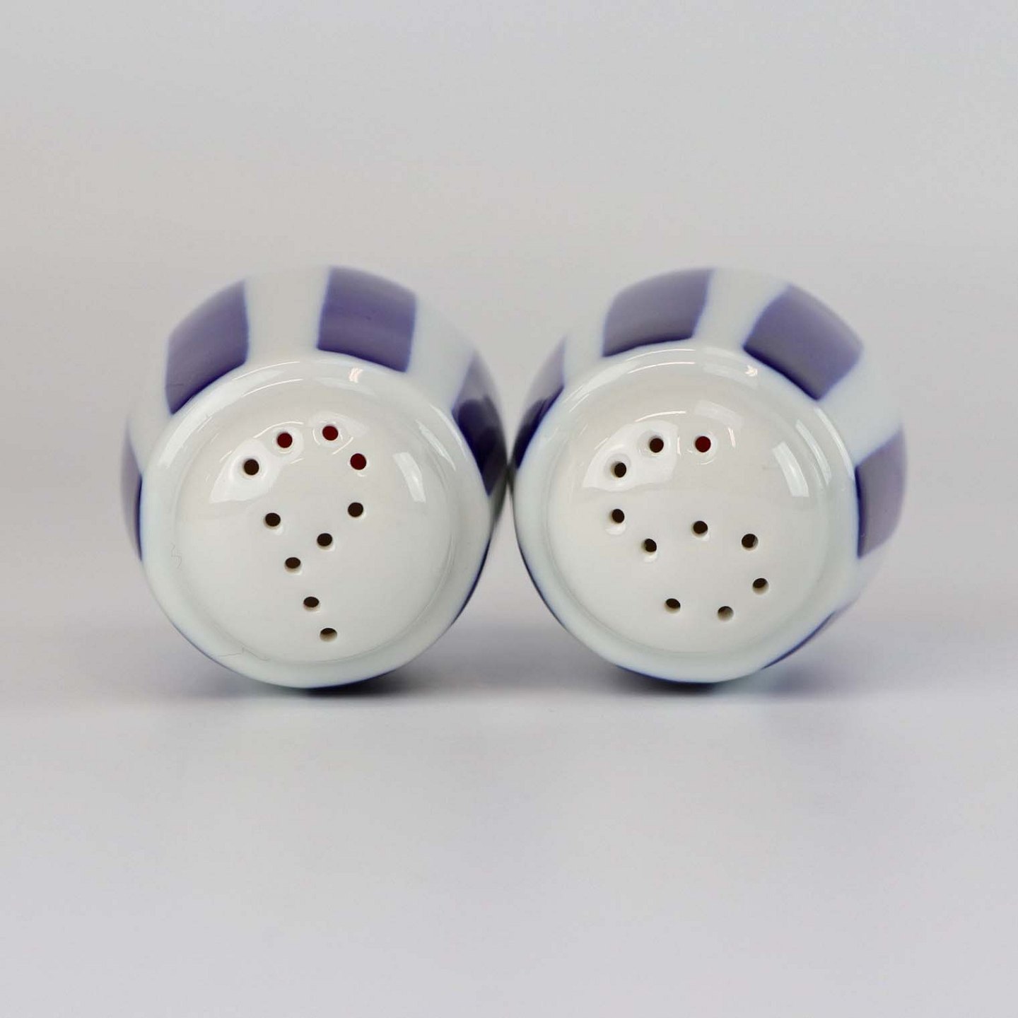 Sæt med saltbøsse og peberbøsse i porcelæn fra stellet blå striber