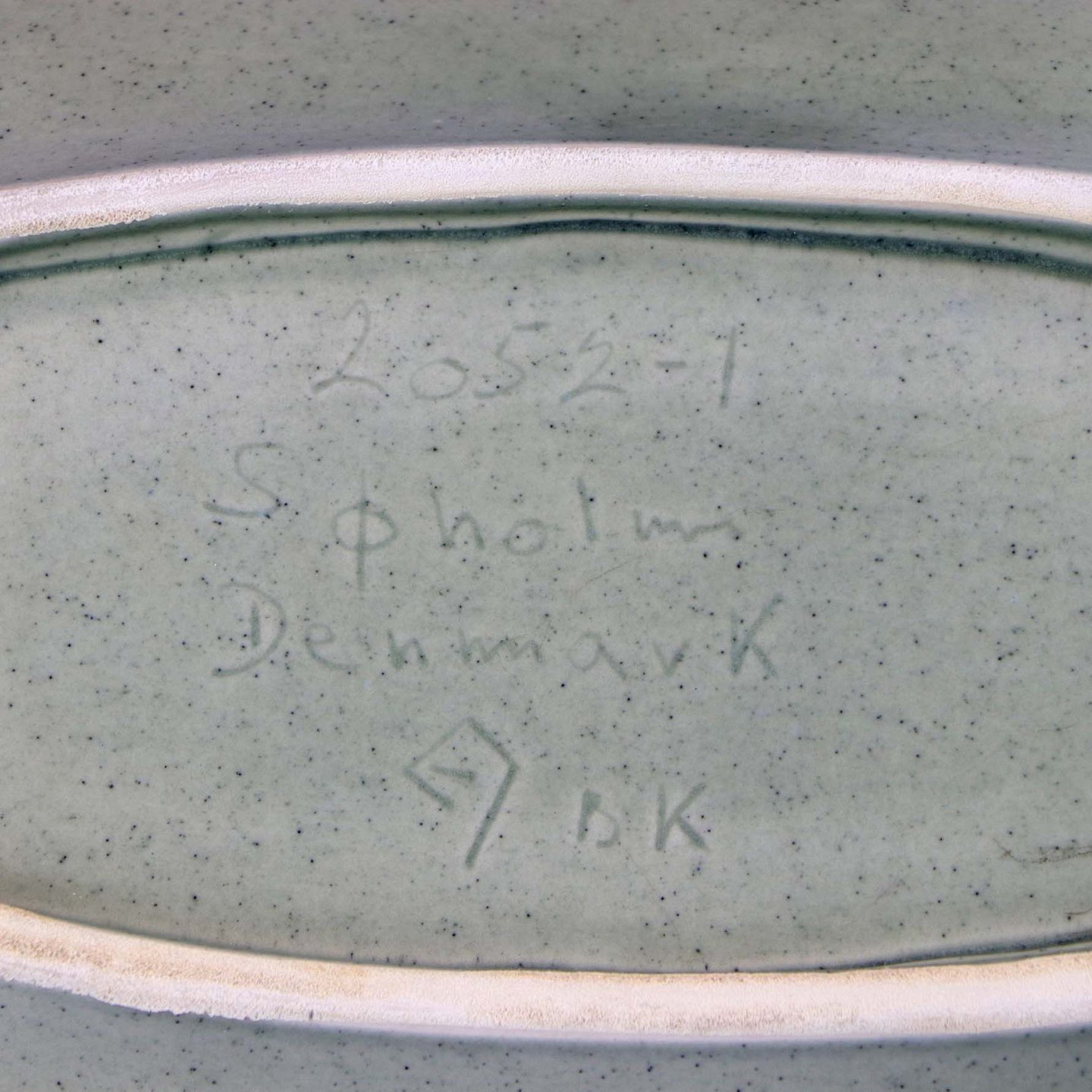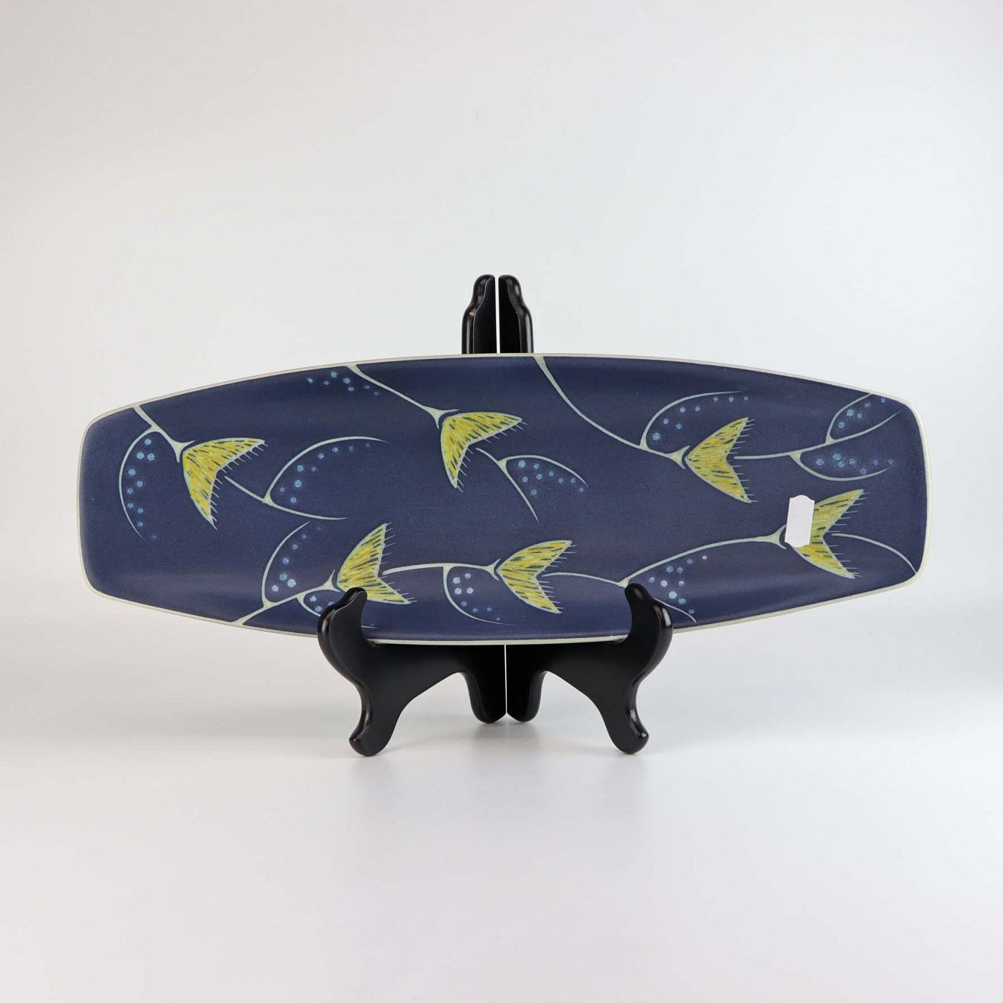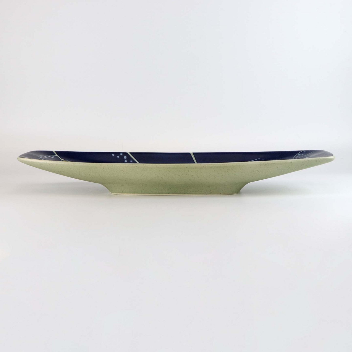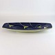 Smalt aflangt fad i keramik nr. 2052-1 med gult motiv på mørkeblå baggrund med lyseblå prikker