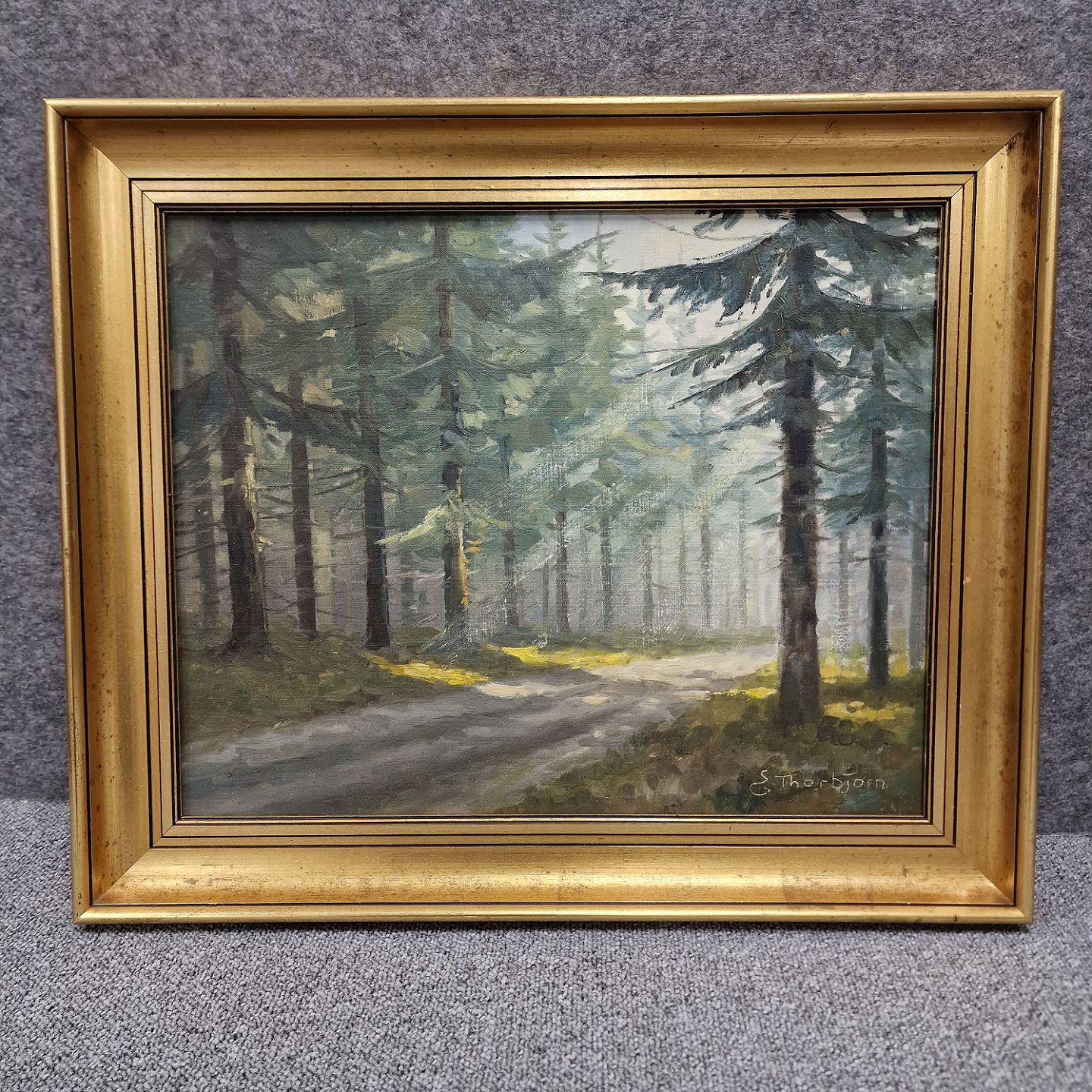 Natur maleri på lærred, med motiv af en skovvej med træer på begge sider. Sandsynligvis Rold skov