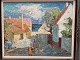 Oliemaleri på lærred med motiv af en gade med huse på begge sider og 3 personer på Bornholm