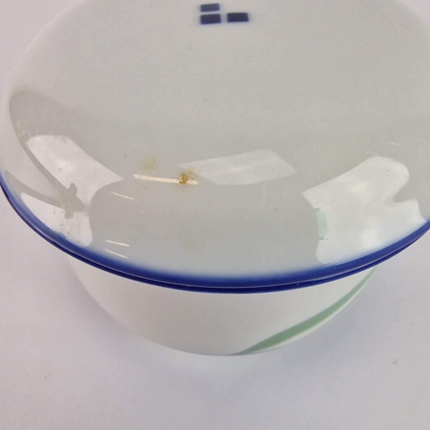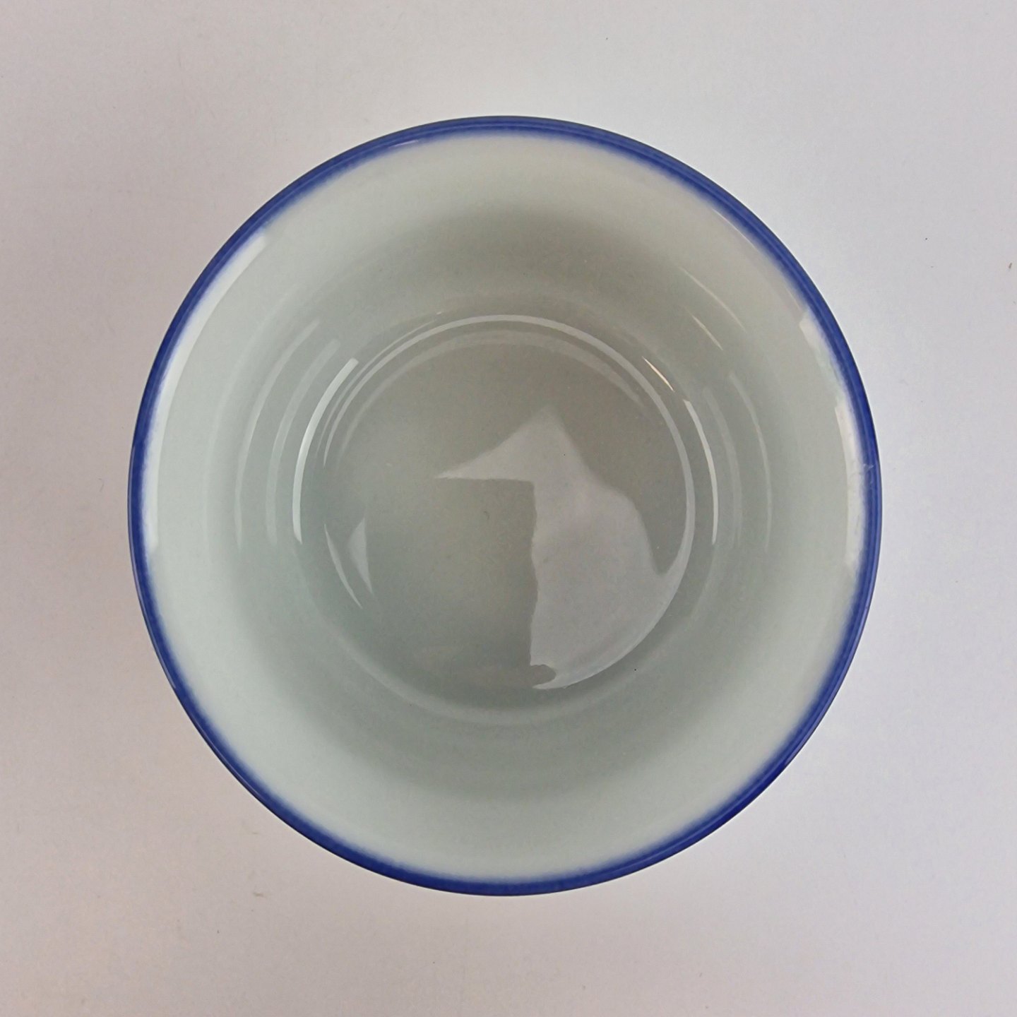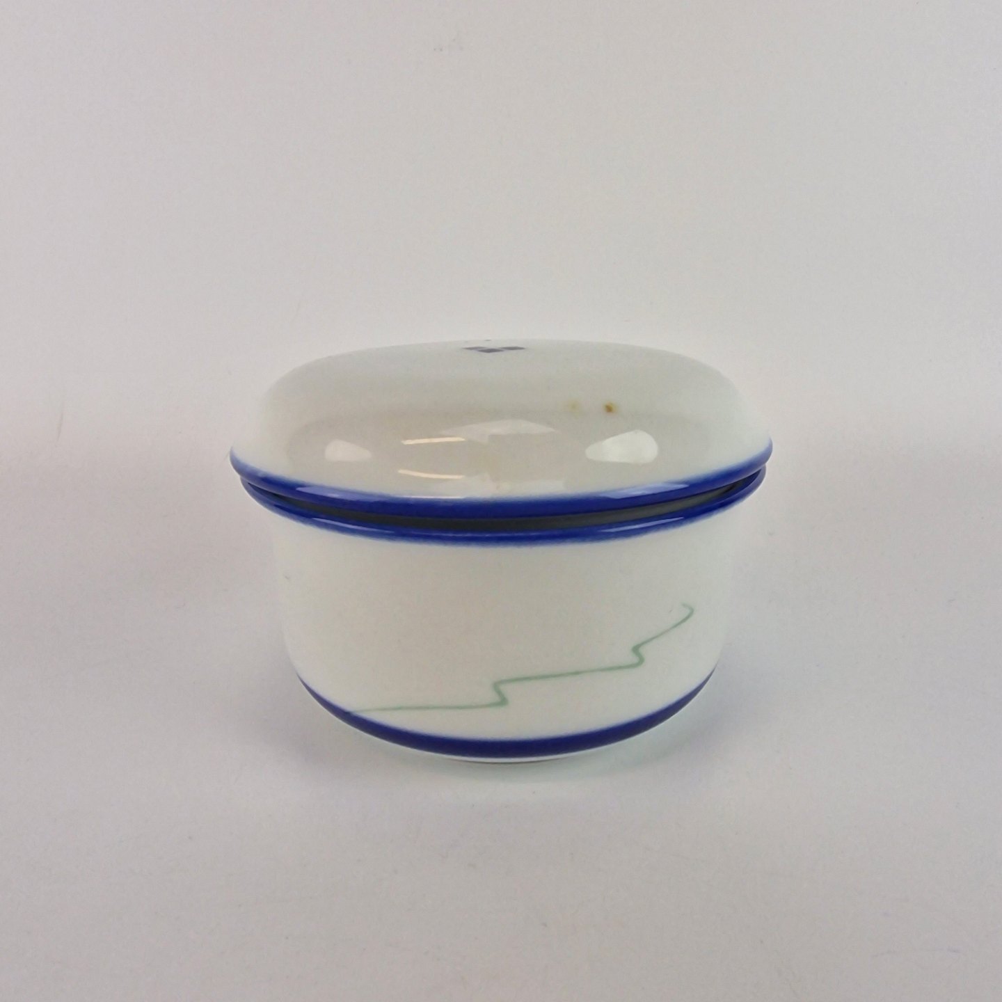 Springtime er af porcelæn, som er glaseret hvidt, malet med blå striber og abstrakt mønster i en lys grøn og blå farve.