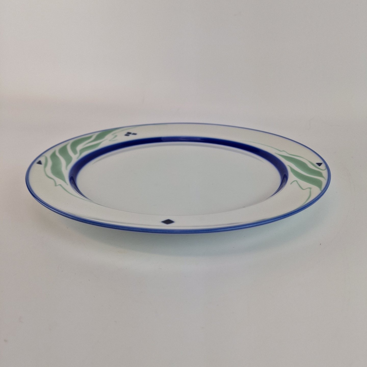 Springtime er af porcelæn, som er glaseret hvidt, malet med blå striber og abstrakt mønster i en lys grøn og blå farve.