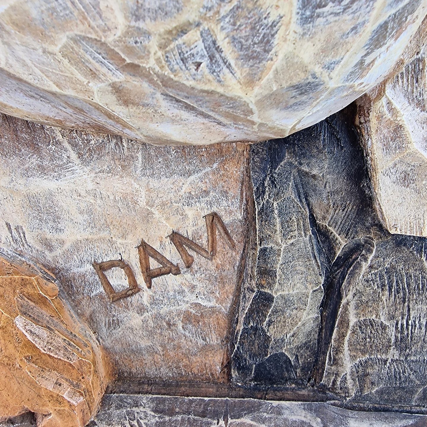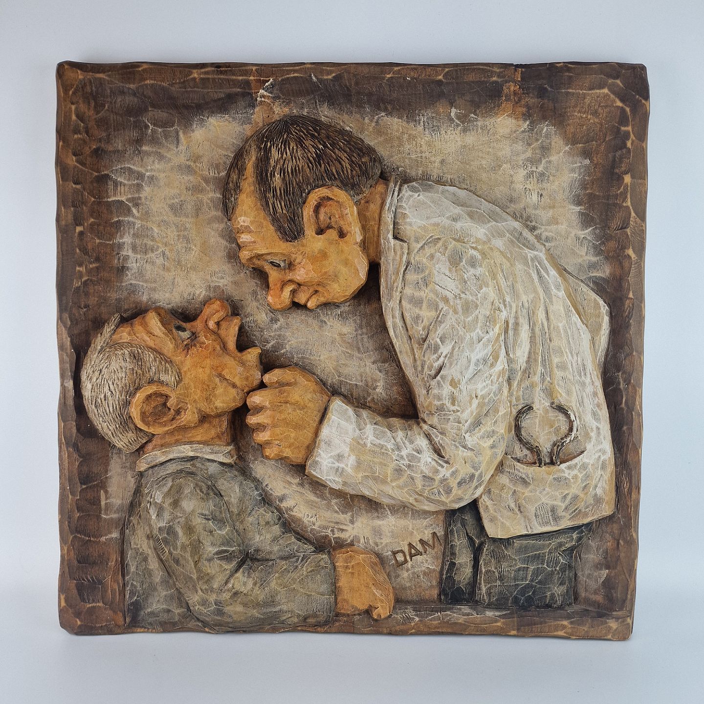 Træudskæring med motiv af en mand og en tandlæge