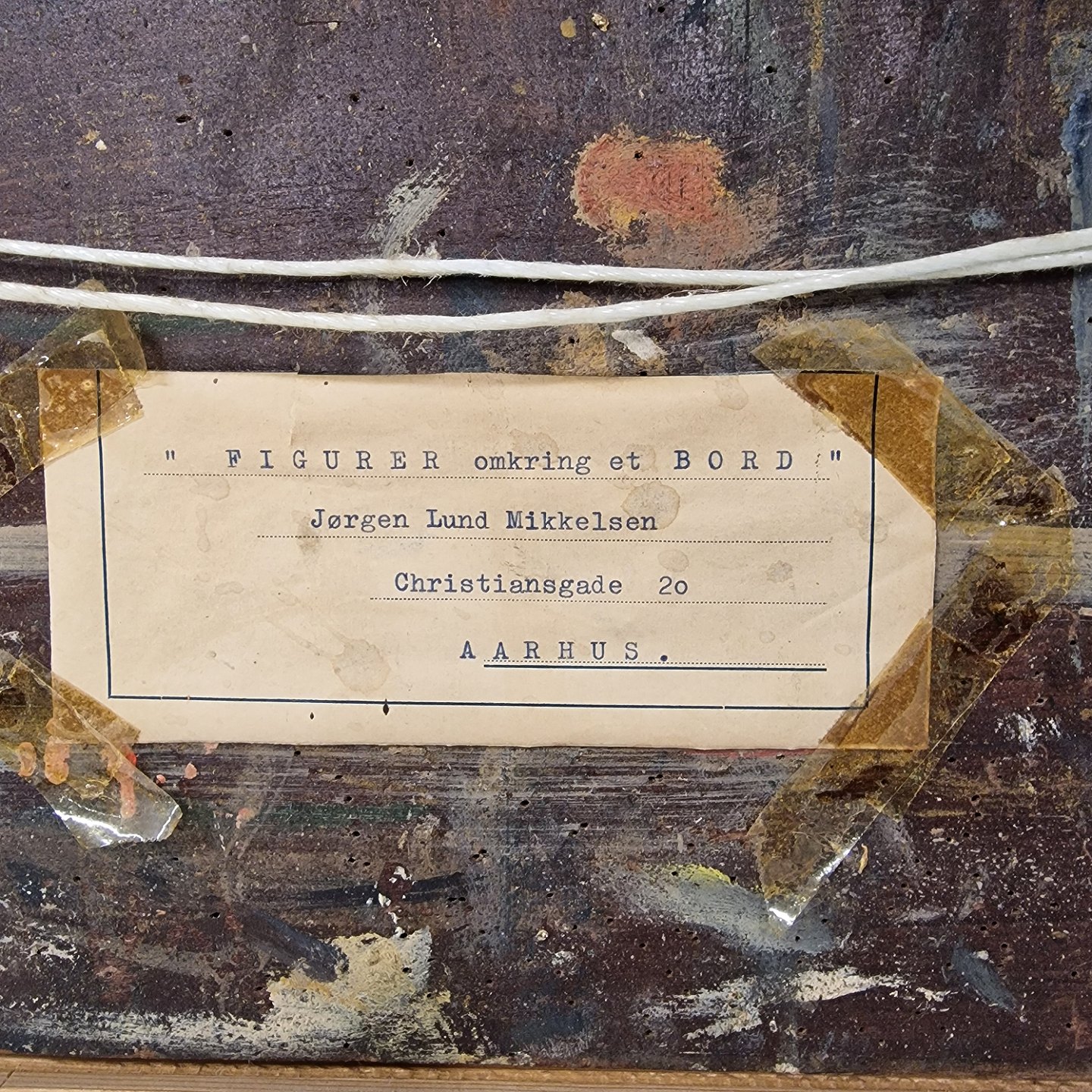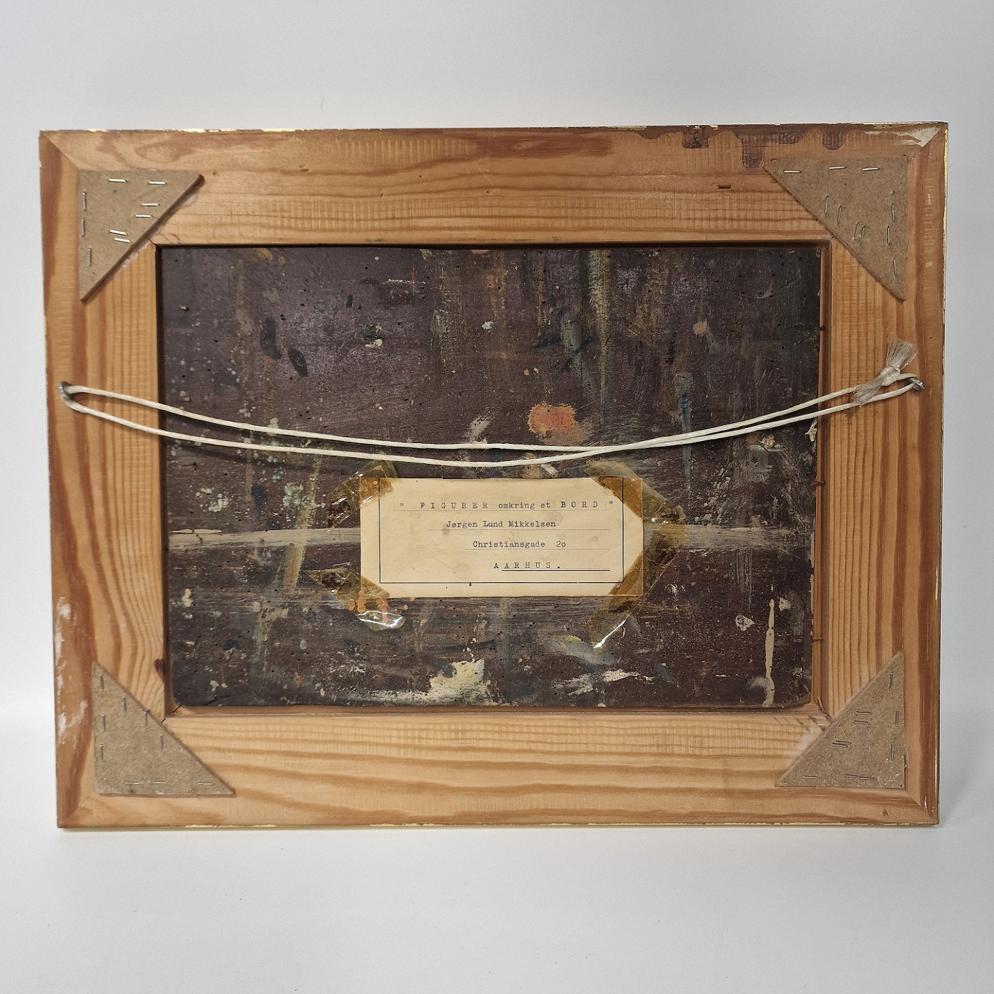 Akrylmaleri på træ med titlen "Figurer omkring et bord"