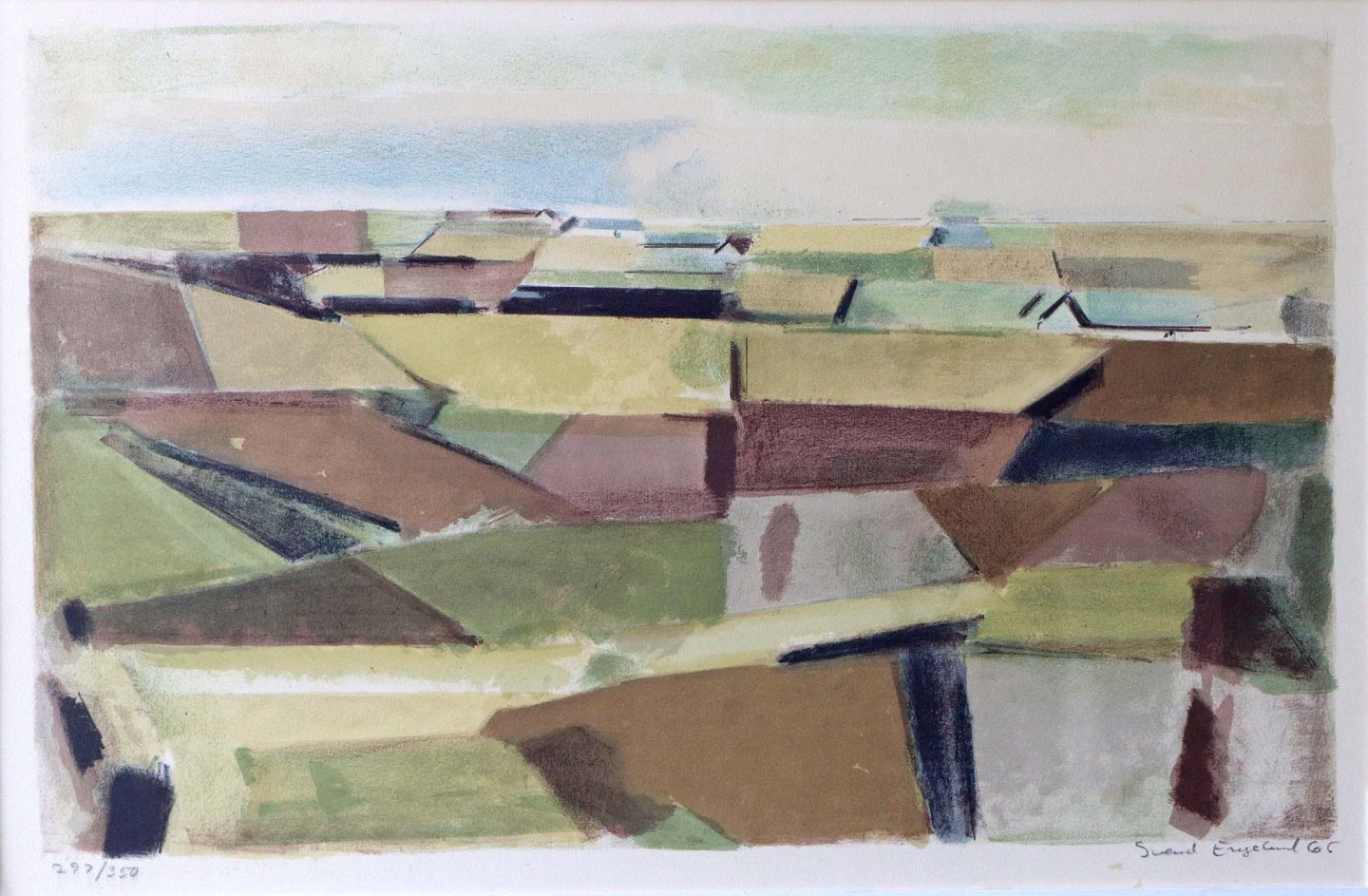 Indrammet litografi med passepartout i sølvmalet ramme. Litografisk tryk med landskabsmotiv nr 297/350 fra år 1965. Motivet er i dæmpede farver og viser udsigten over marker.