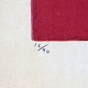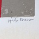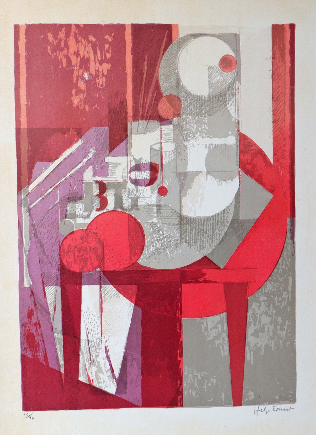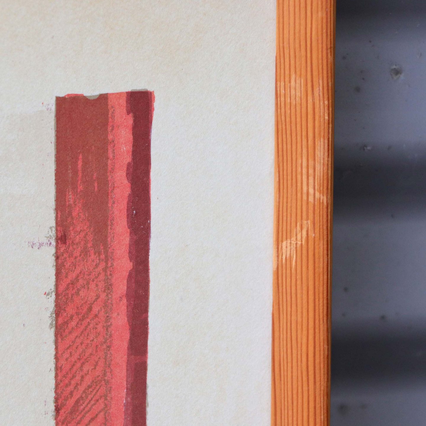 Indrammet litografi i ramme. Litografisk tryk nr 16/90 med abstrakt motiv i rød, lilla, grå og hvide farver.