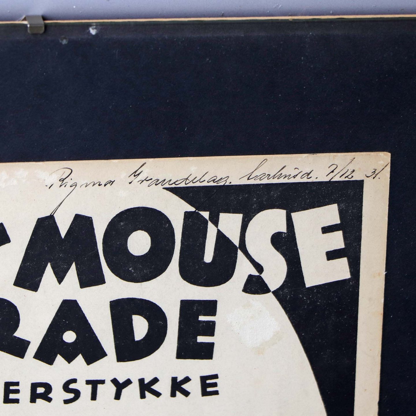 Indrammet tryk i skifteramme. Gammelt grafisk tryk i sort og hvid fra år 1931 med titlen Micky Mouse Parade, Karakterstykke af Heinrich Müller. Blæk notat i øverst højre hjørne, også fra 1931
