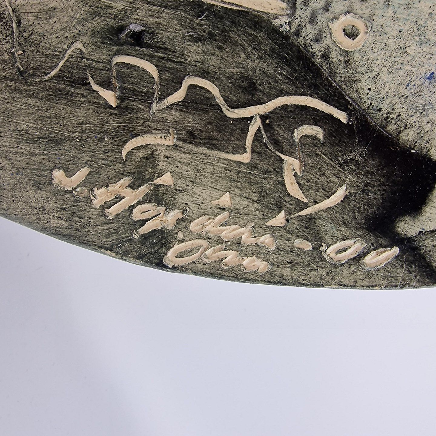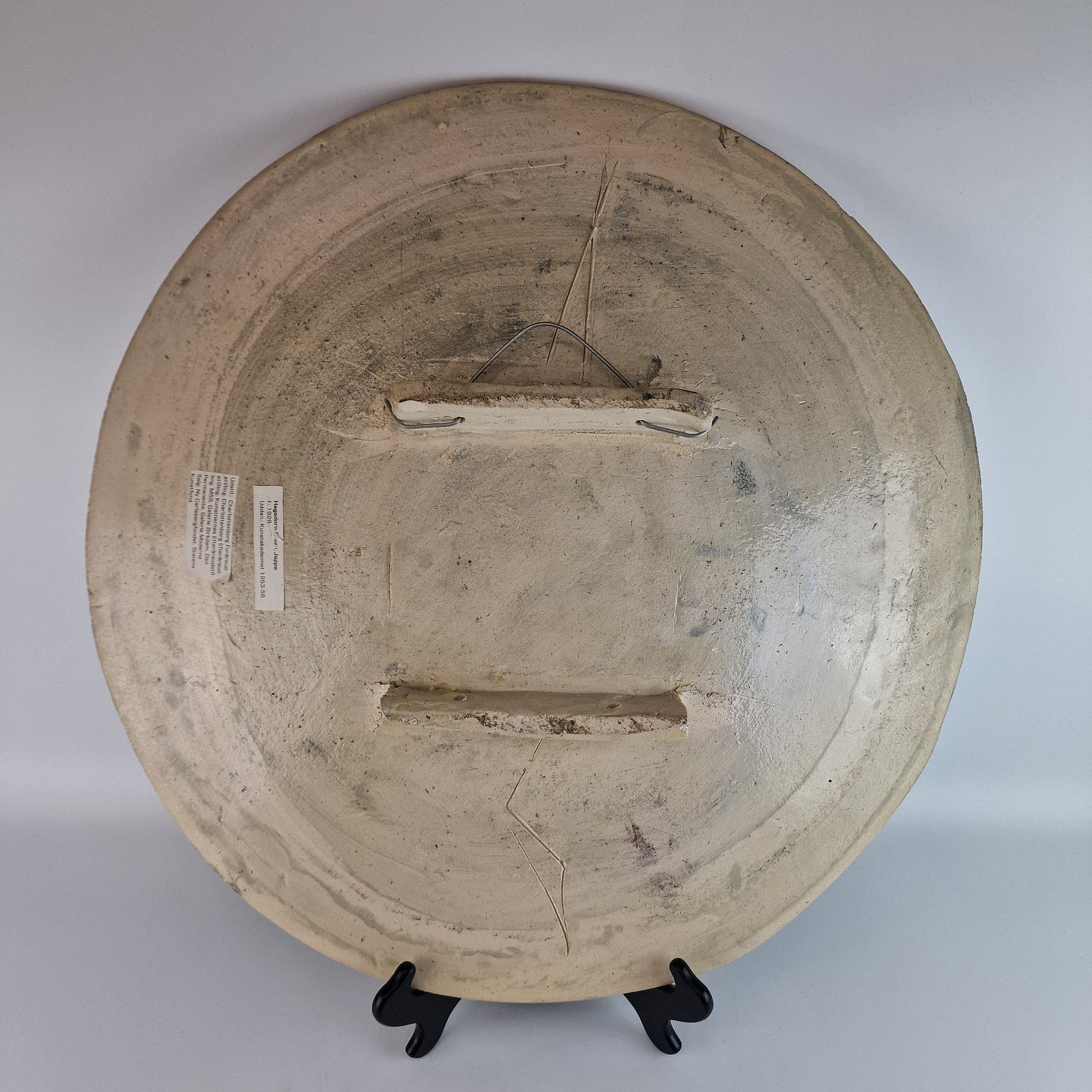 Stort rundt unika keramikfad med abstrakt motiv. Kan bruges på bord eller væg. Der er vægophæng.