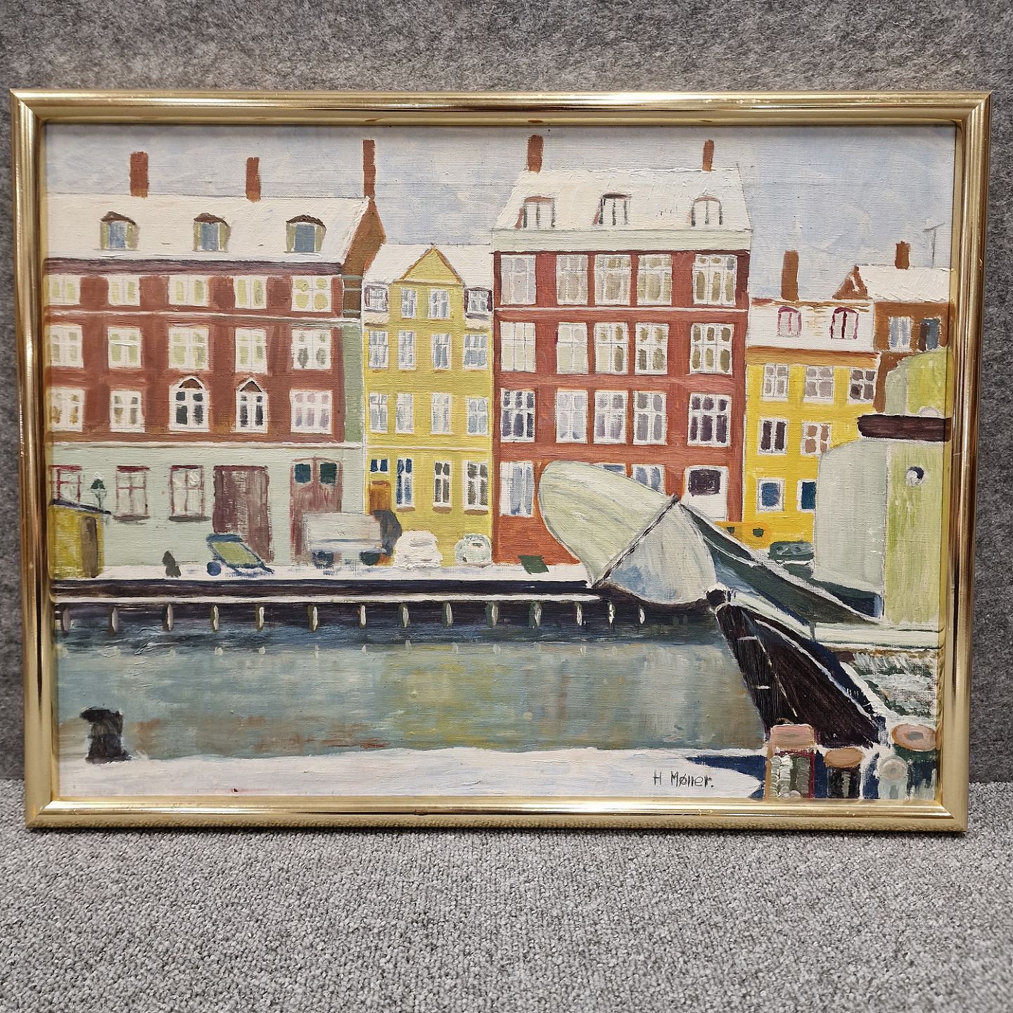 Maleri på lærred med motiv af huse og et skib. Nyhavn