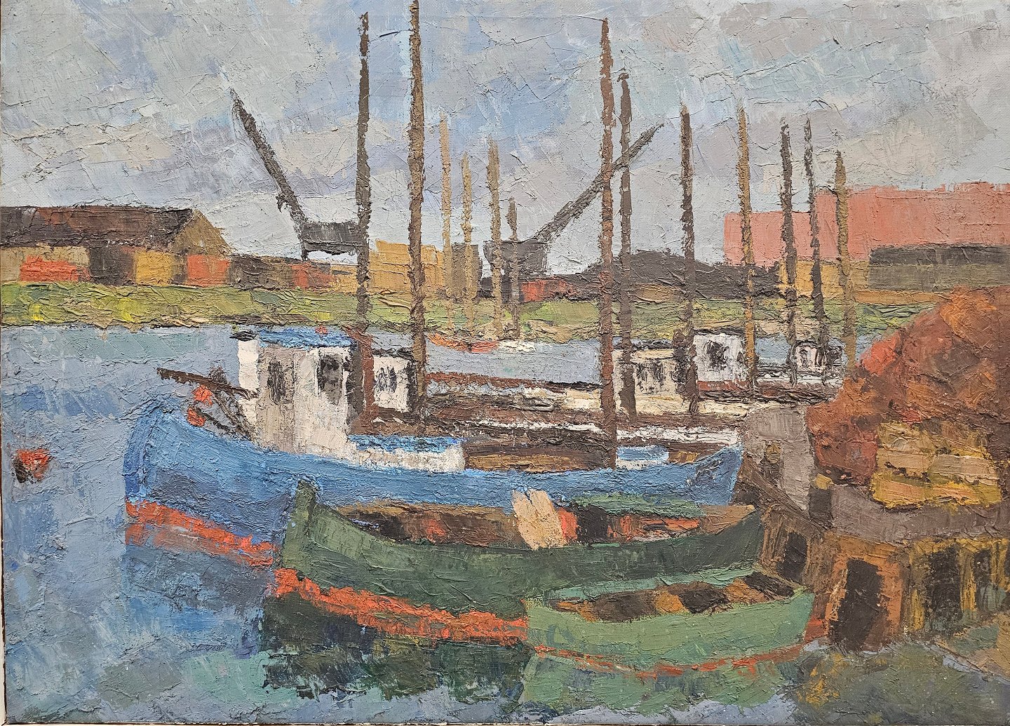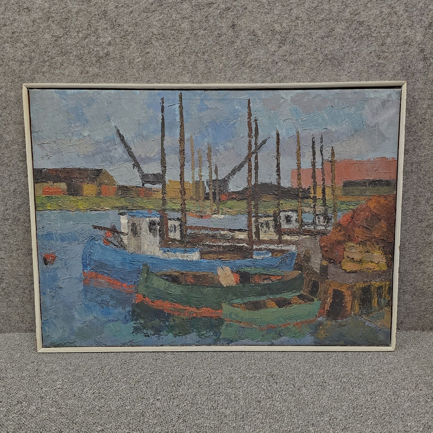 Maleri af oliemaling på lærred, med motiv af en havn med fiskekutterer og huse